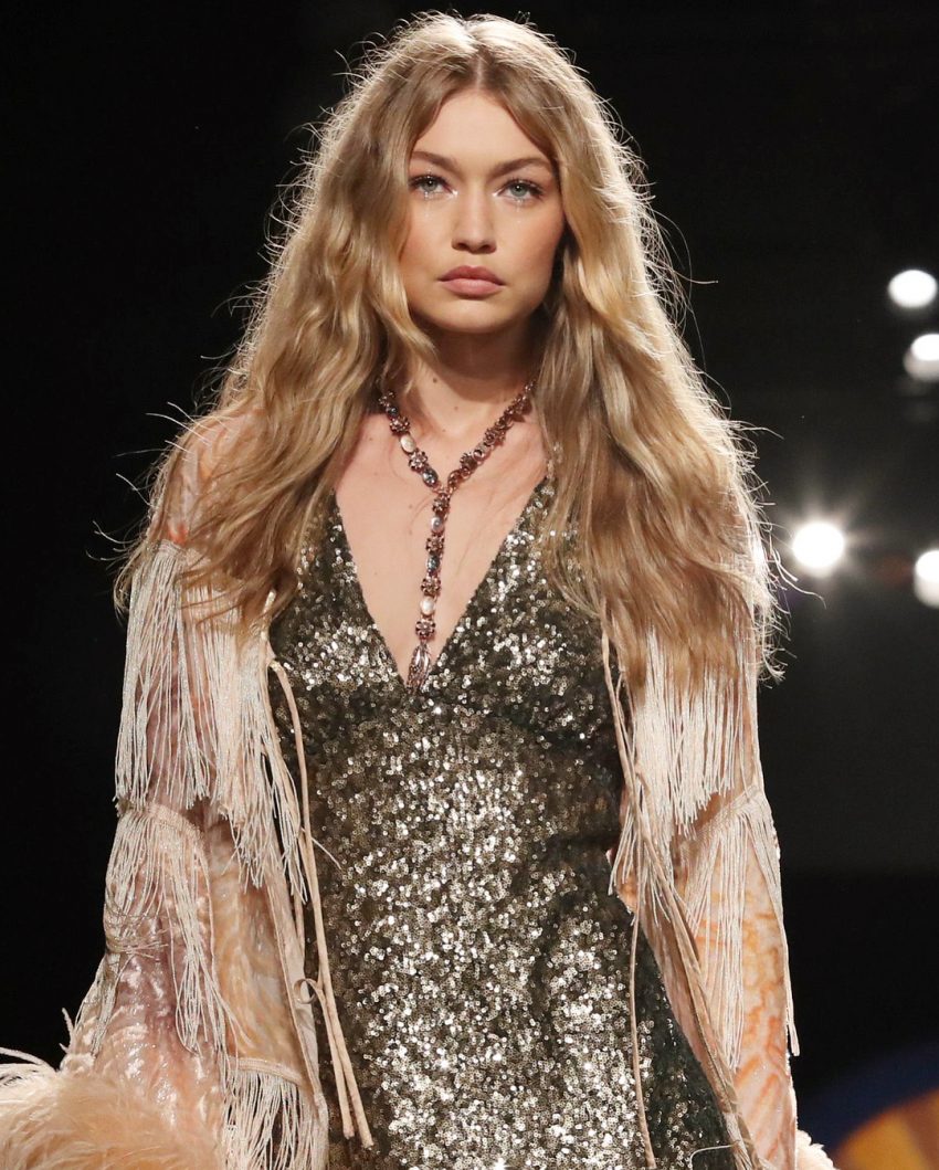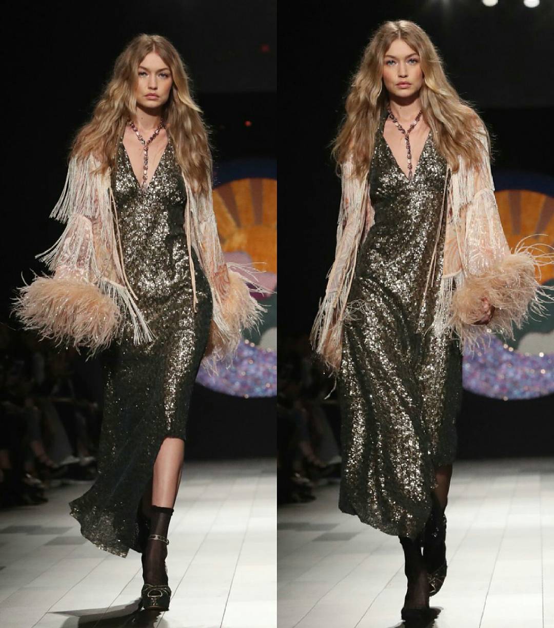 Gigi Hadid preparava-se para apresentar um dos dois looks que tinha quando surgiu na passerelle com um vestido de lantejoulas e um casaco com plumas. Tudo muito bem, mas nos pés só tinha um sapato.