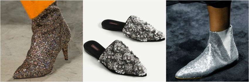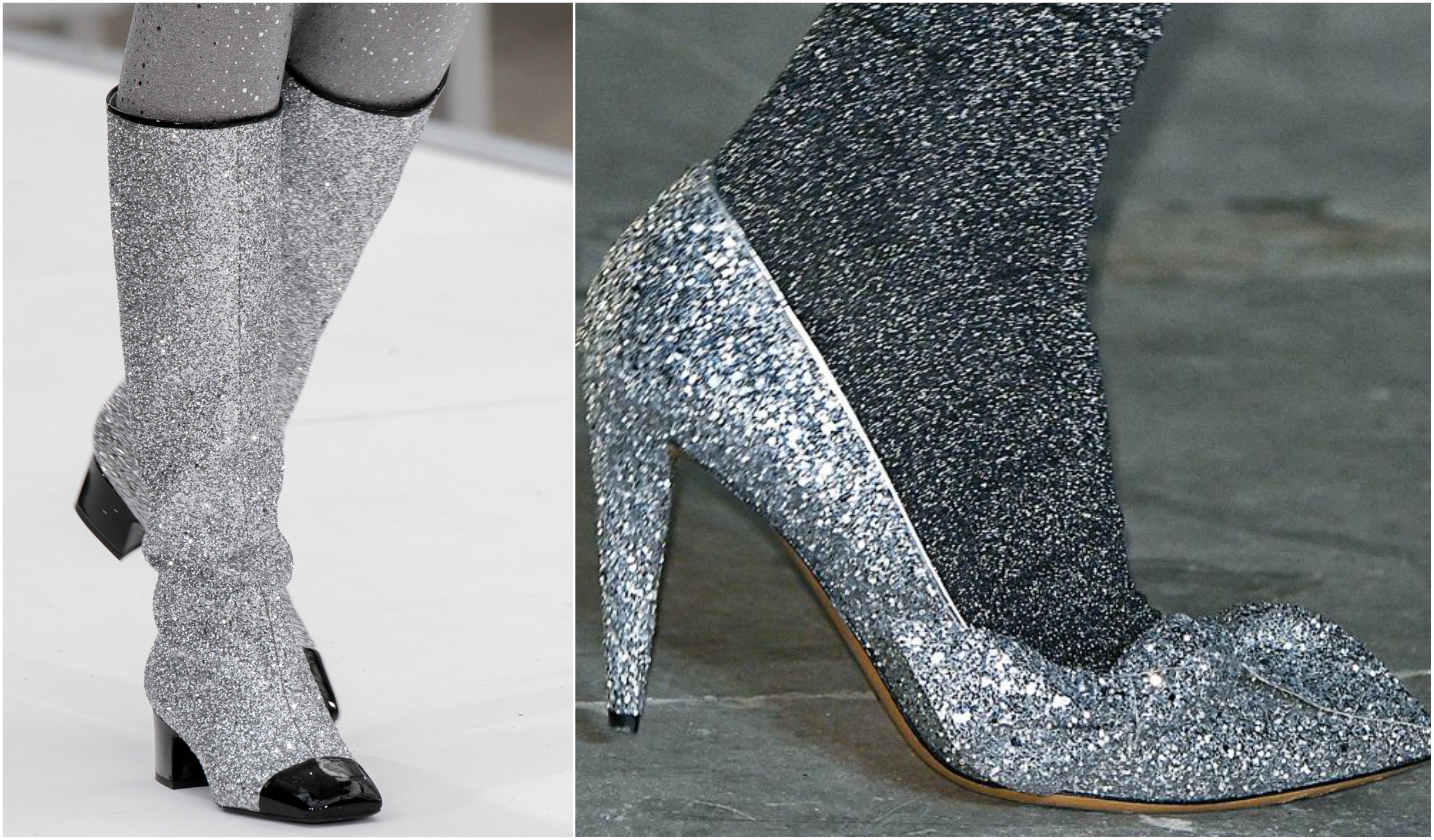 Várias foram as maisons que puseram brilho nas botas, sapatos stiletto (salto agulha), chinelos e afins: Chanel, Isabel Marant, Saint Laurent, Loewe, Uterqüe, Attico, Missoni, etc.