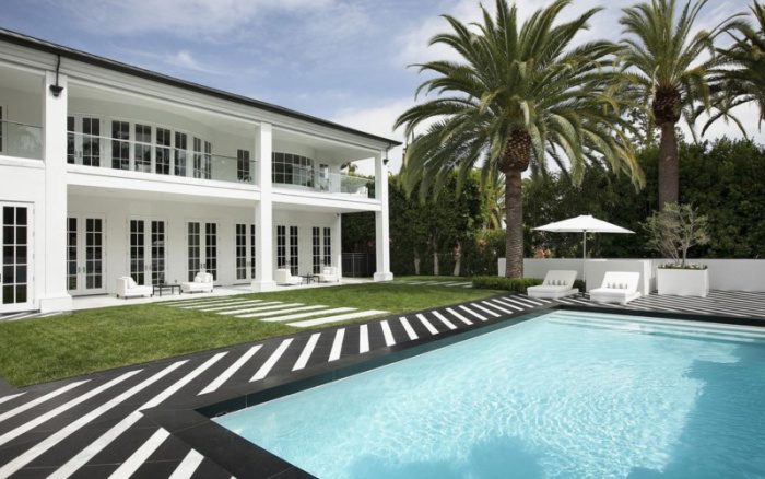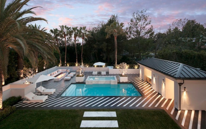 A suite principal tem banheira de hidromassagem (com um terraço feito de árvores), o deck da piscina é em mármore preto e branco e existe ainda uma casa de hóspedes anexa.
