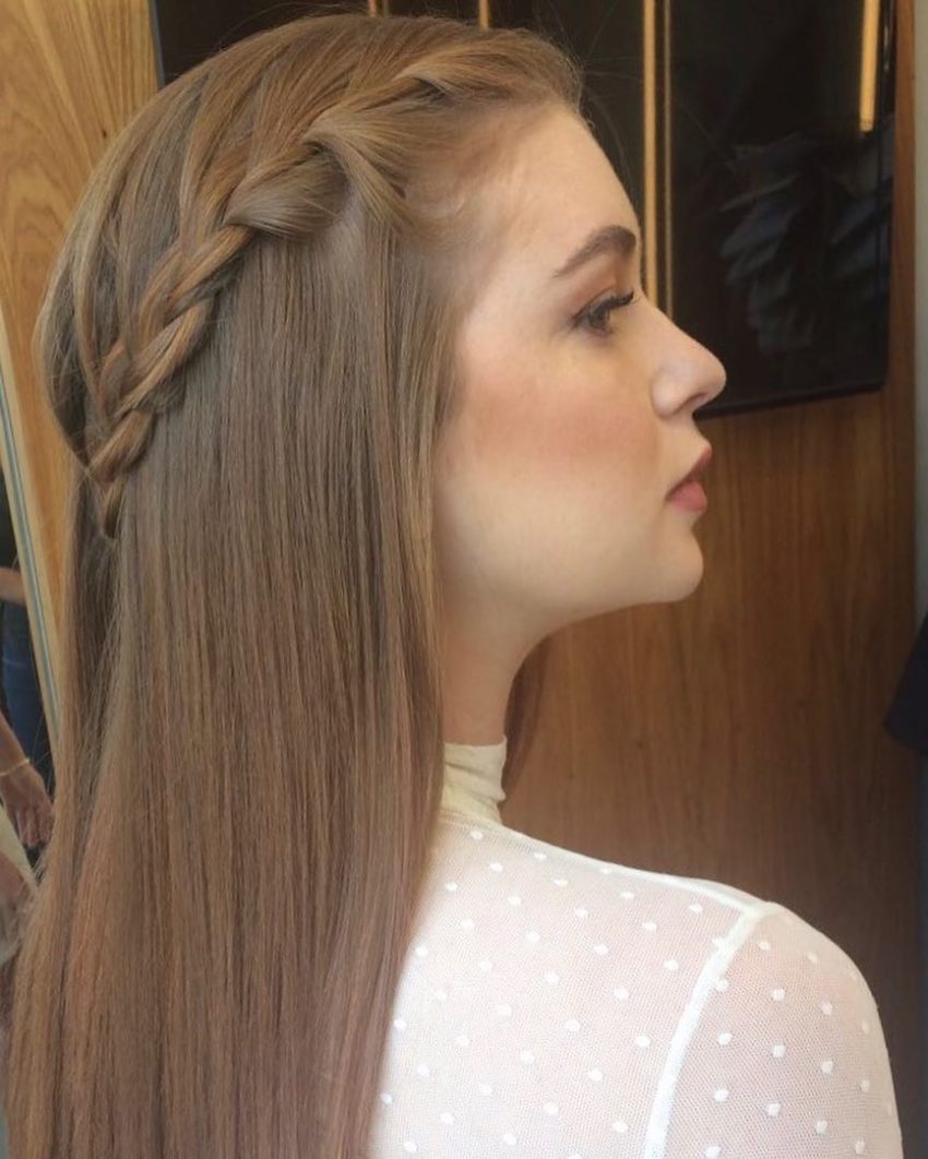 A atriz usou um penteado simples e elegante, com uma trança, e uma maquilhagem sóbria e com tons nude.