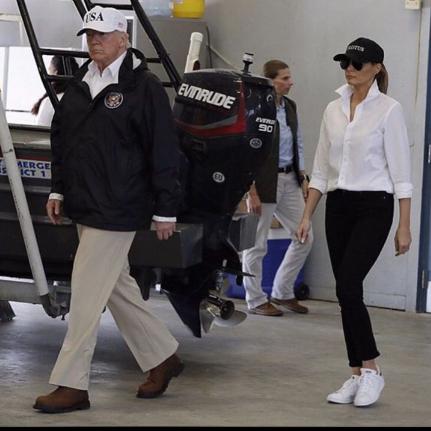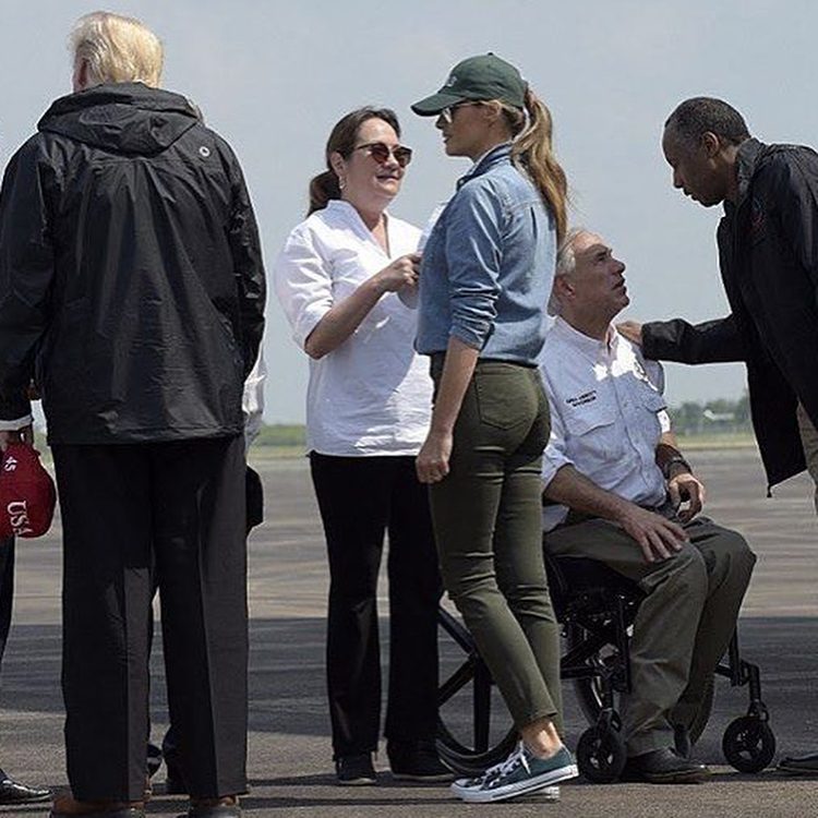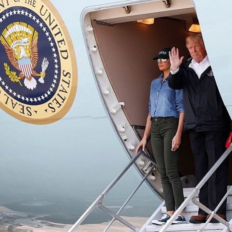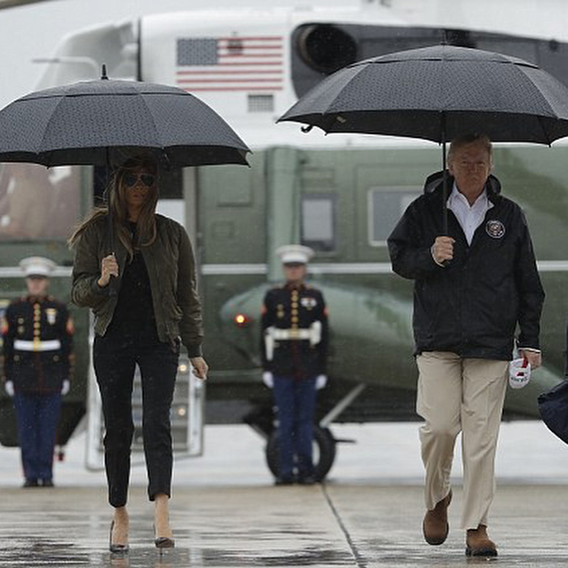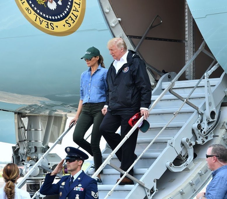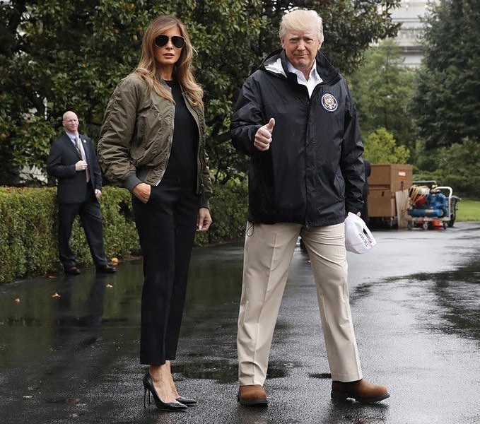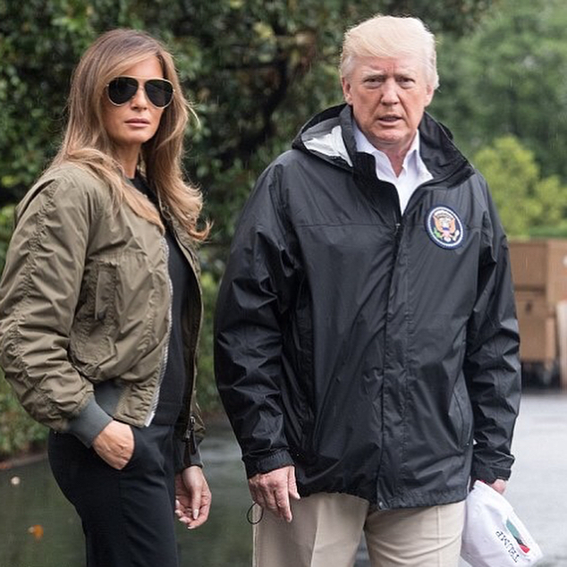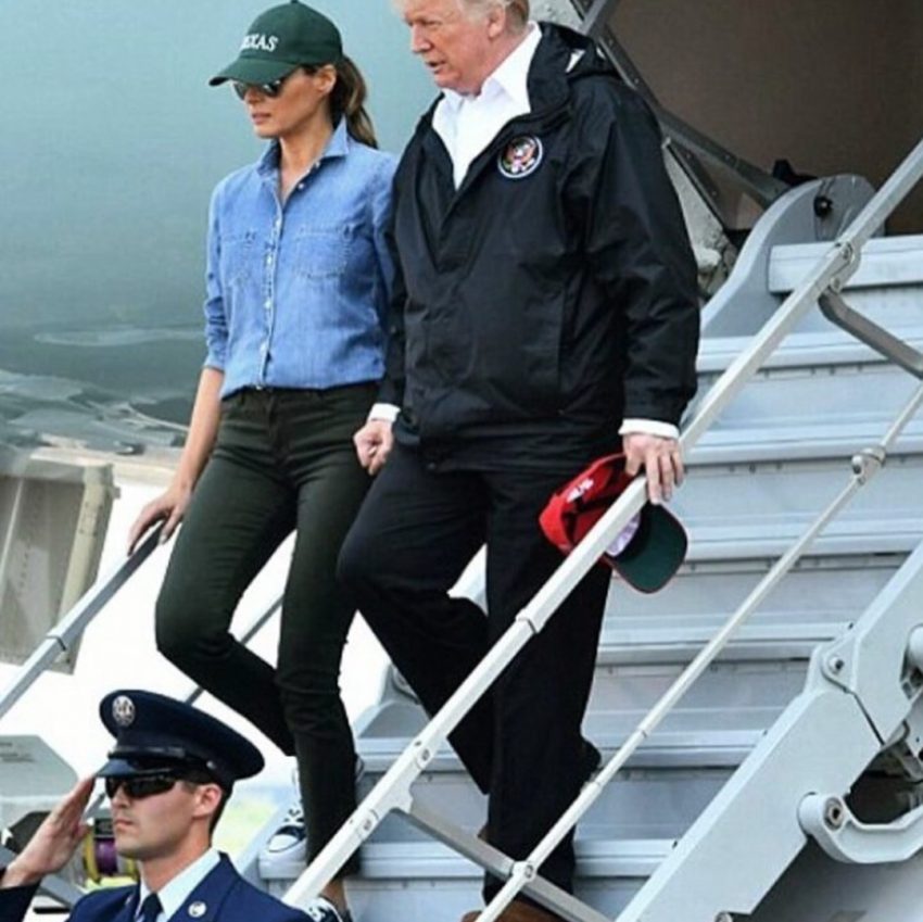 Na terça-feira, o casal presidencial foi ao Texas visitar voluntários que ajudam as vítimas do furacão Harvey e encontrar-se com o governador Greg Abbott, mas não visitou um dos abrigos de evacuação no local. Isso e o facto de Melania Trump ter surgido de bomber verde tropa, top e calças pretas, óculos de sol aviador mas com stilettos (sapatos de salto alto) pretos provocaram ainda mais críticas.