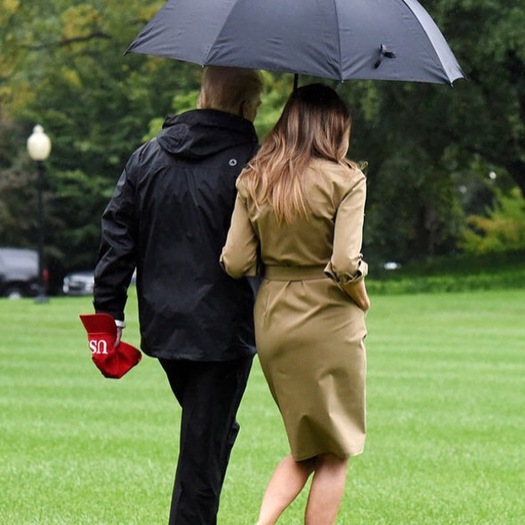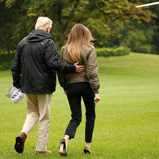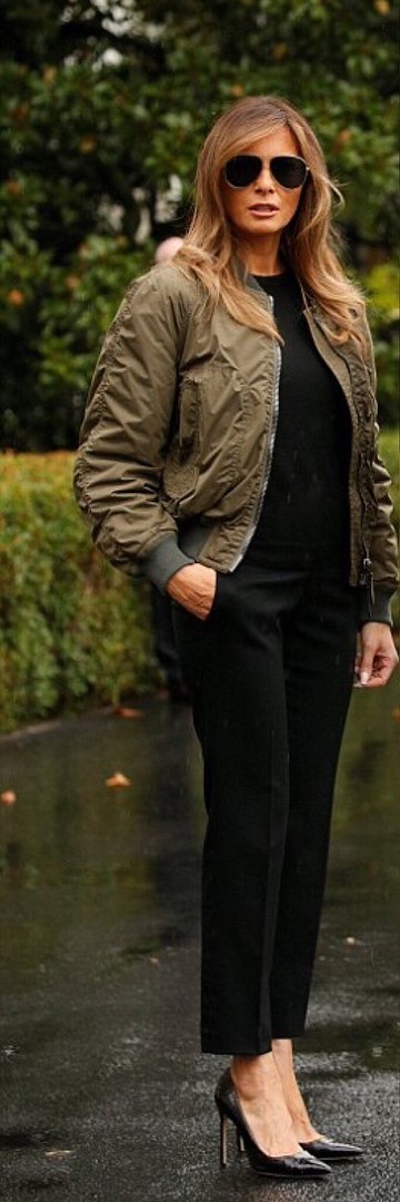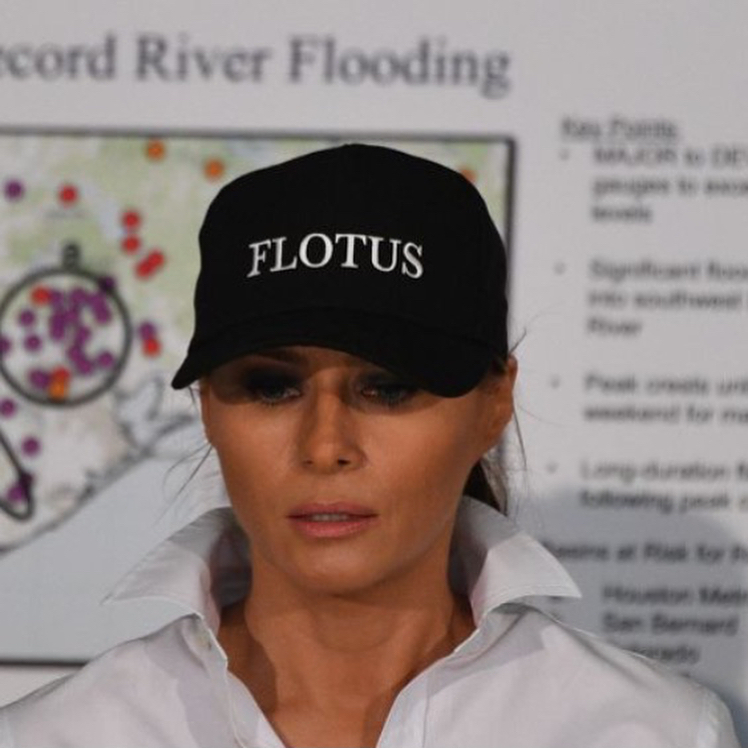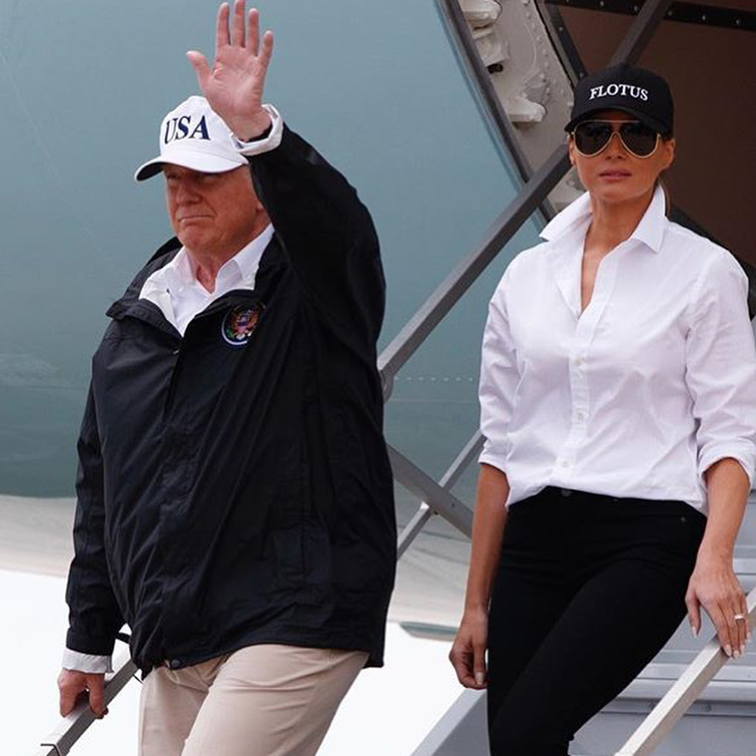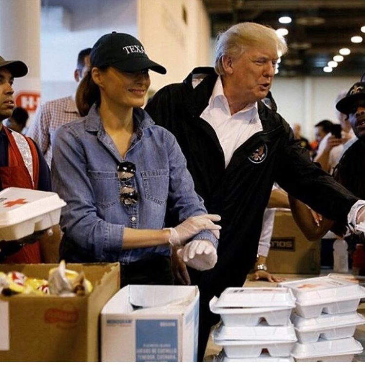 Na terça-feira, o casal presidencial foi ao Texas visitar voluntários que ajudam as vítimas do furacão Harvey e encontrar-se com o governador Greg Abbott, mas não visitou um dos abrigos de evacuação no local. Isso e o facto de Melania Trump ter surgido de bomber verde tropa, top e calças pretas, óculos de sol aviador mas com stilettos (sapatos de salto alto) pretos provocaram ainda mais críticas.