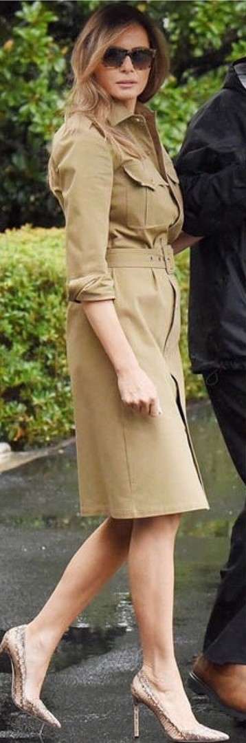 No sábado de manhã, Melania e Donald Trump fizeram a segunda visita a Houston. Desta vez a antiga modelo eslovena optou por um vestido verde tropa Ralph Lauren, de 1590 dólares, e sapatos de estampado de cobra Manolo Blahnik, de 650 dólares.