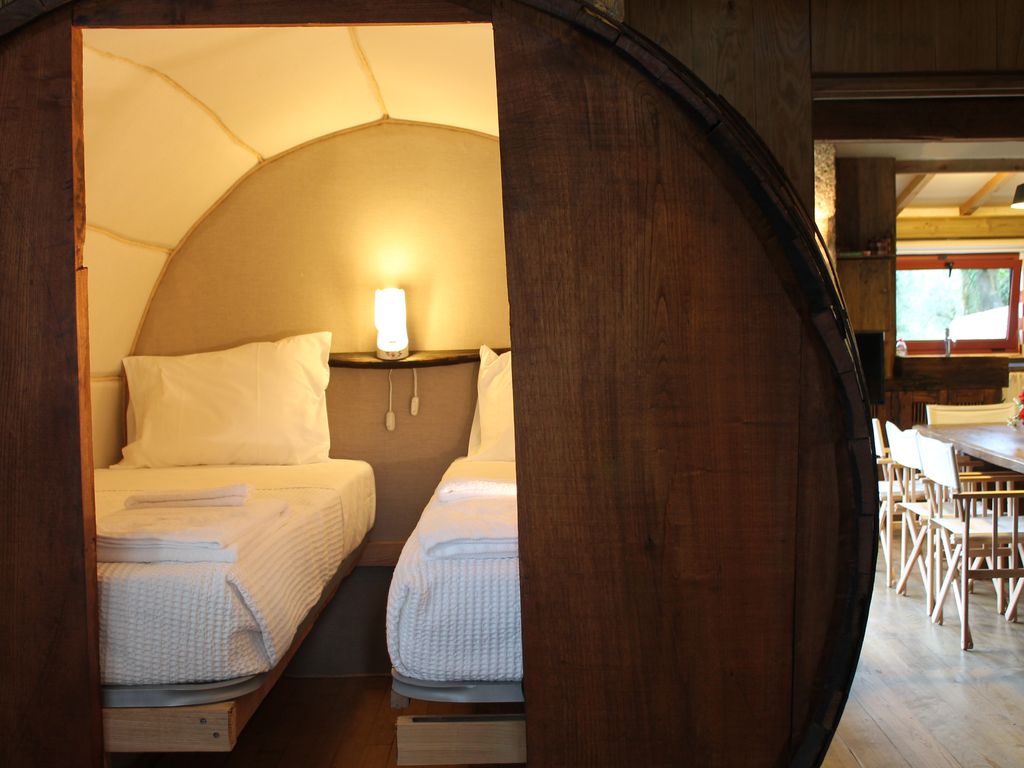 E aqui estamos: uma casa equipada e confortável como as outras mas cujas camas ficam dentro de tonéis.