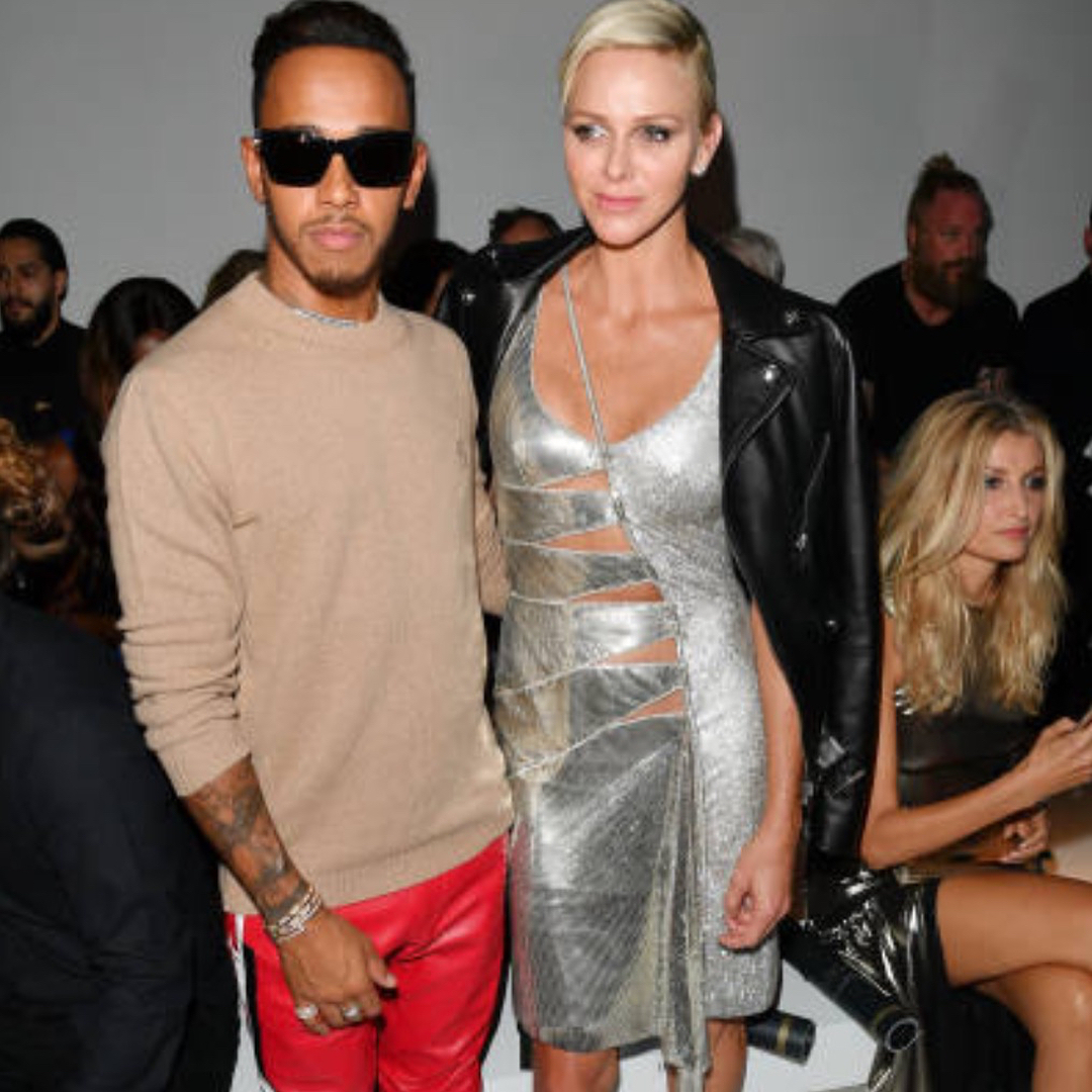 Aqui, a princesa Charlene voltou a posar com o piloto britânico, que já tinha conhecido anteriormente durante o Monaco Grand Prix.