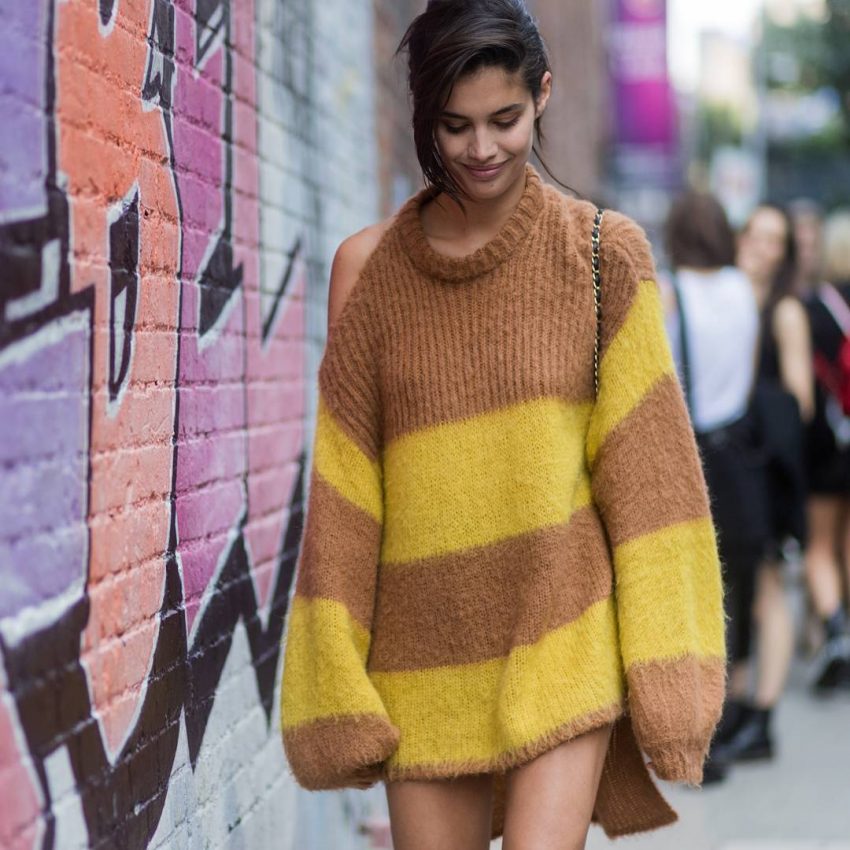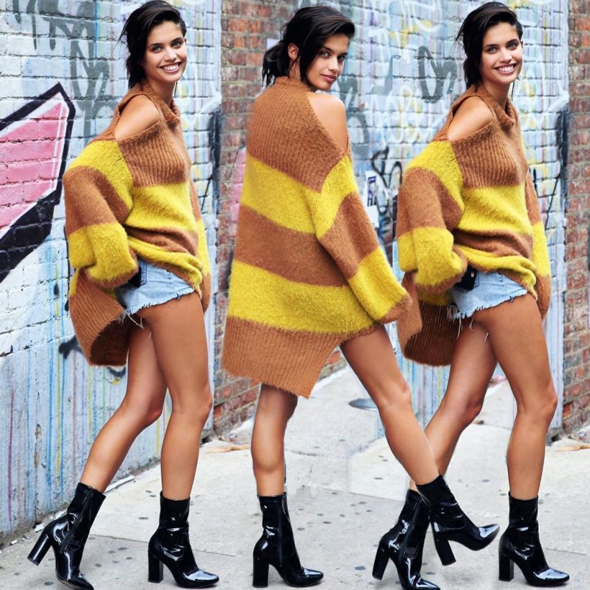 Já o seu ‘oufit’ fora da ‘runway’ foi muito mais modesto, mas igualmente estiloso: uma camisola larga castanha e amarela e de ombros ao descoberto, uns calções de ganga curtos e botas pretas de pele.