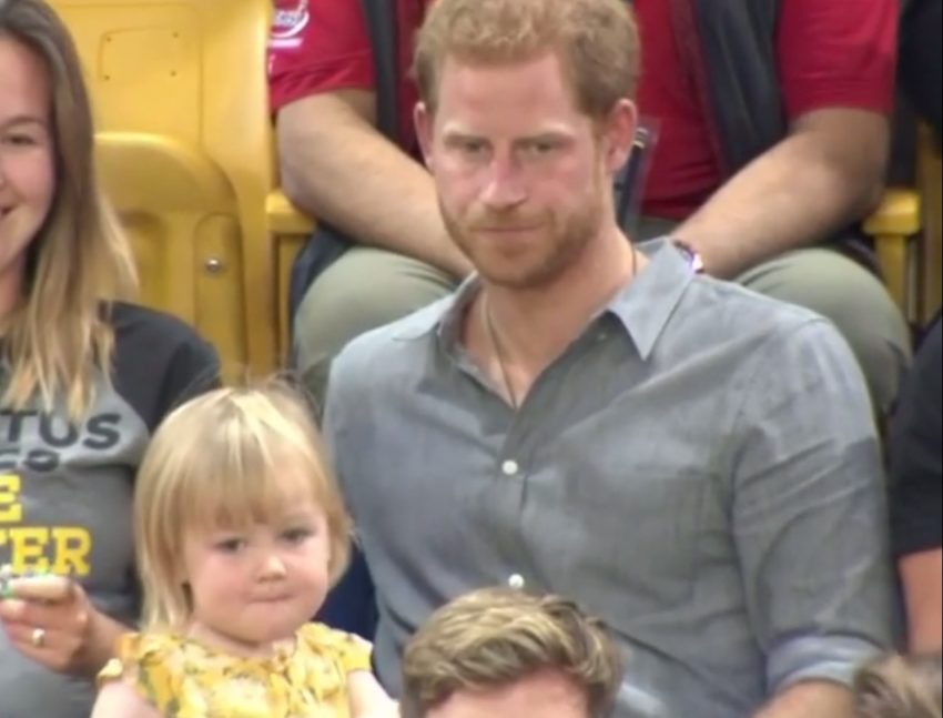 Tudo aconteceu quando, na bancada VIP, uma menina de três anos “roubou” pipocas do pacote que o príncipe Harry segurava na mão.