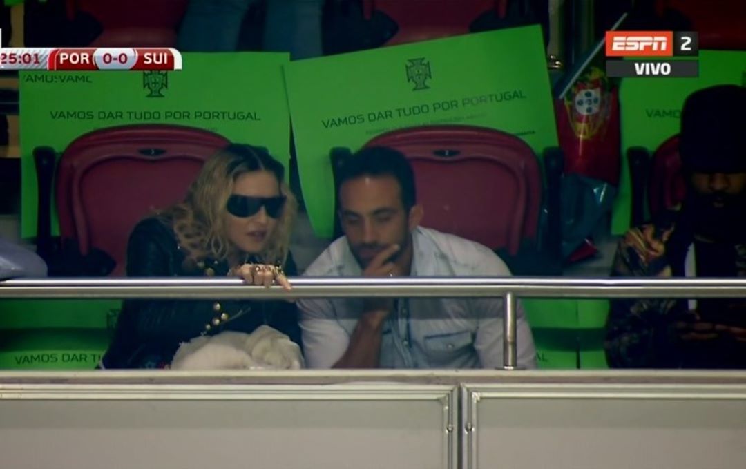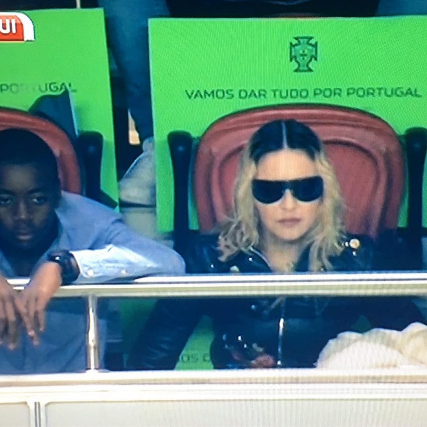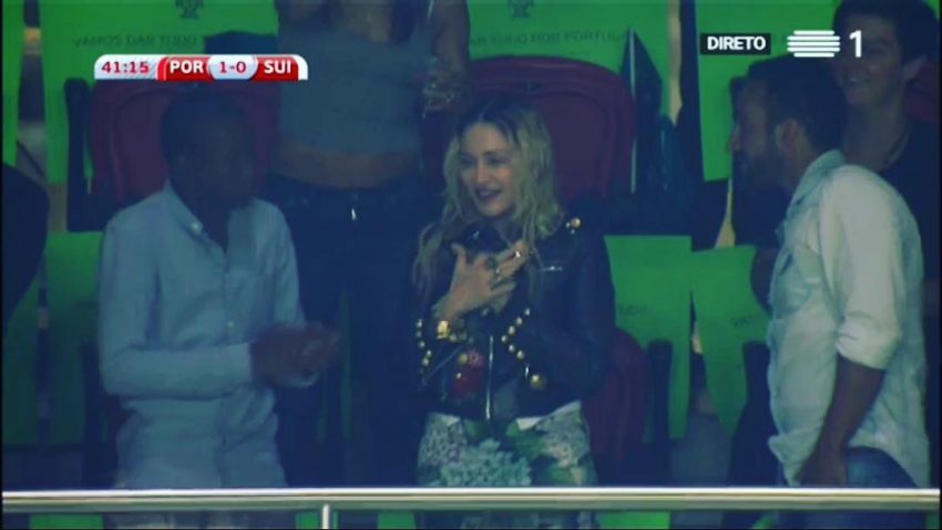 Sentada num camarote VIP, a ouvir com atenção o que um amigo lhe estava a dizer e com a bandeira nacional e os cartazes da Federação Portuguesa de Futebol por trás. Foi assim que Madonna foi filmada pelas câmaras de televisão esta terça-feira.