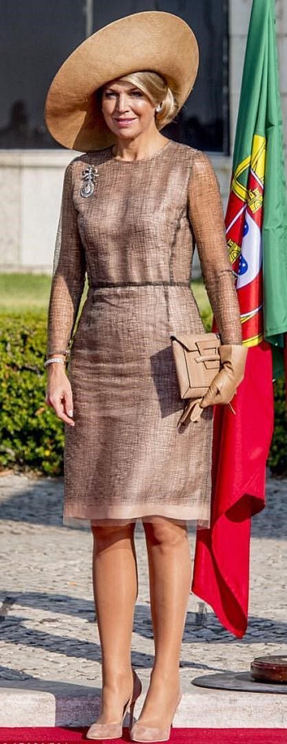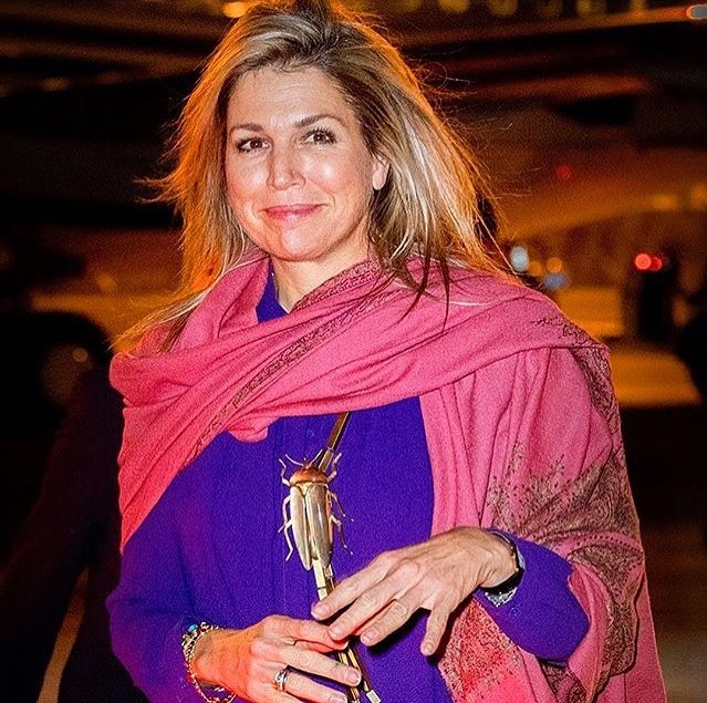Máxima usava umas calças azuis, blusa roxa, écharpe rosa e o destaque foi para uma espécie de broche que trazia ao peito, em forma de besouro. O adereço é da marca Jan Taminiau e já não é a primeira vez que a rainha usa algo do género.