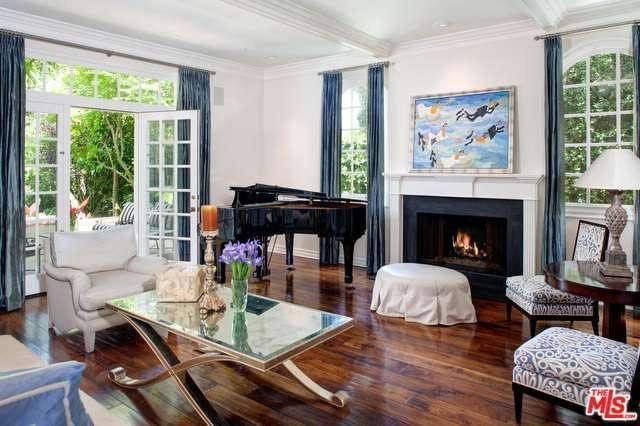 A sala de estar tem uma lareira tradicional, piano de cauda e janelas enormes que permitem que entre muita luz solar, enquanto as portas duplas conduzem a um terraço exterior e área de estar.