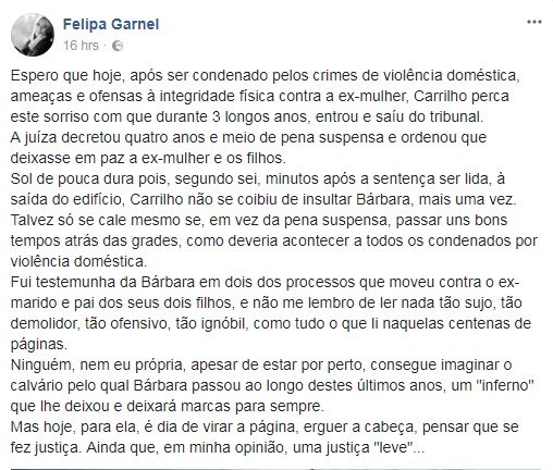 Bem mais longa e arrasadora foi Felipa Garnel. A igualmente apresentadora foi testemunha de Bárbara Guimarães e, na mensagem que deixou nas redes sociais, assegurou que Carrilho terá insultado a ex-mulher, uma vez mais, à saída do tribunal. Veja o texto na íntegra: