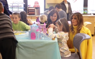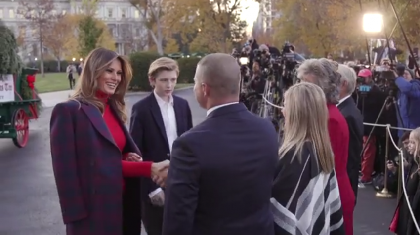 Melania apresentou o filho ao restante staff, enquanto algumas crianças assistiam à chegada da árvore junto ao Pórtico Norte da Casa Branca.