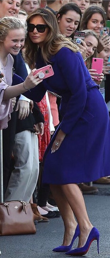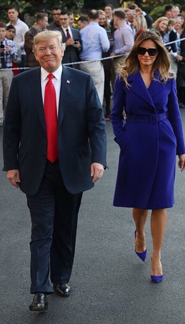 À saída da Casa Branca, rumo ao Air Force One, Melania Trump usou um casaco azul Emilio Pucci e stilettos azuis Louboutin, uma das suas marcas de eleição.