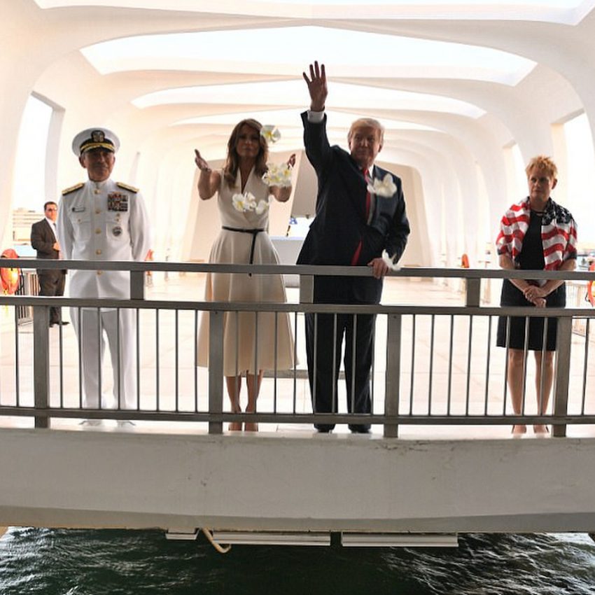 Já na chegada ao Hawaii, onde visitou a base norte-americana de Pearl Harbor e de onde partirá para sua primeira viagem pela Ásia, brilhou com um vestido branco Dior.