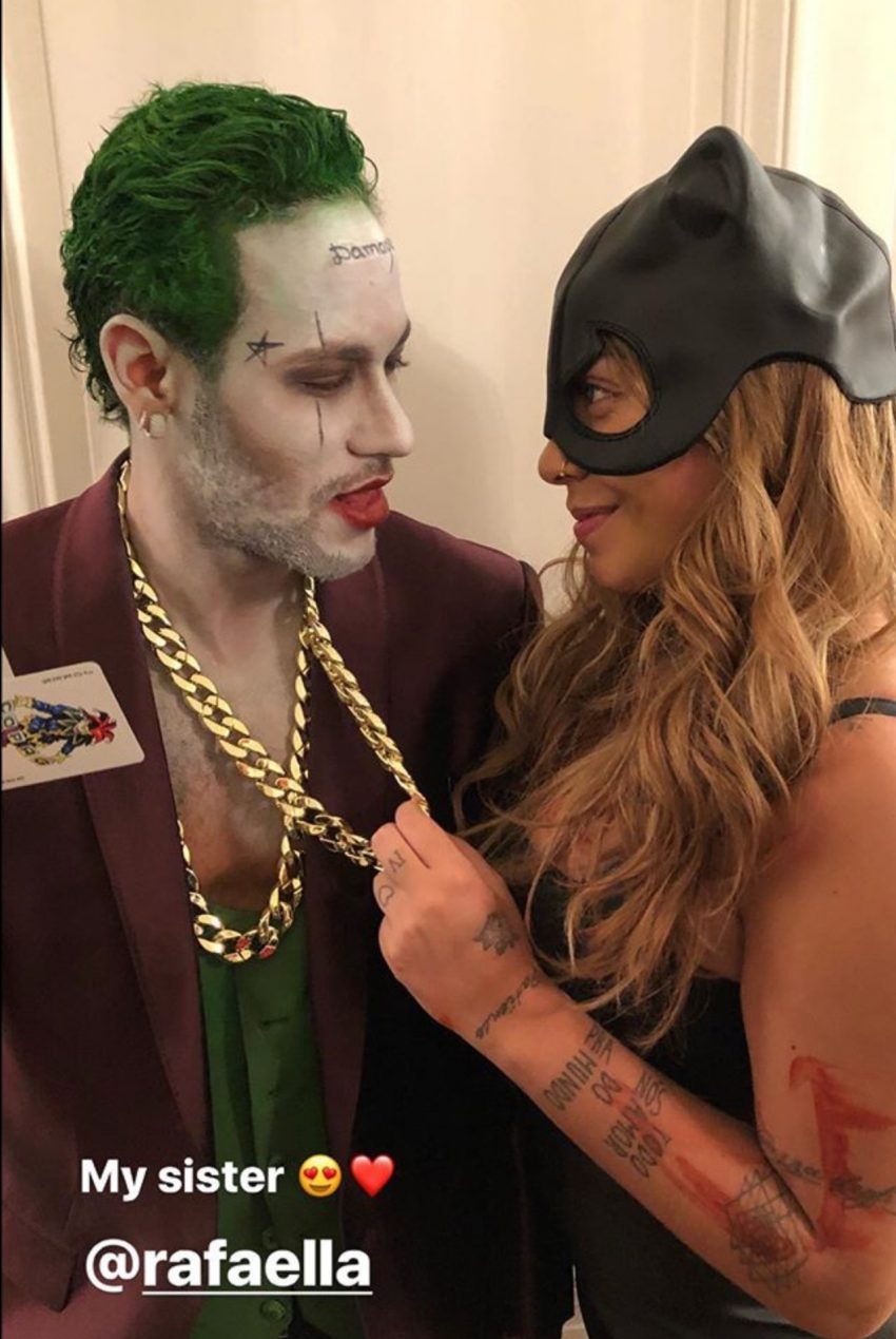 No Instagram, o futebolista brasileiro partilhou várias fotografias da folia, uma delas com a irmã, Rafaella Santos, e outra com a modelo israelita Bar Zomer que foi a que menos ousou no disfarce.