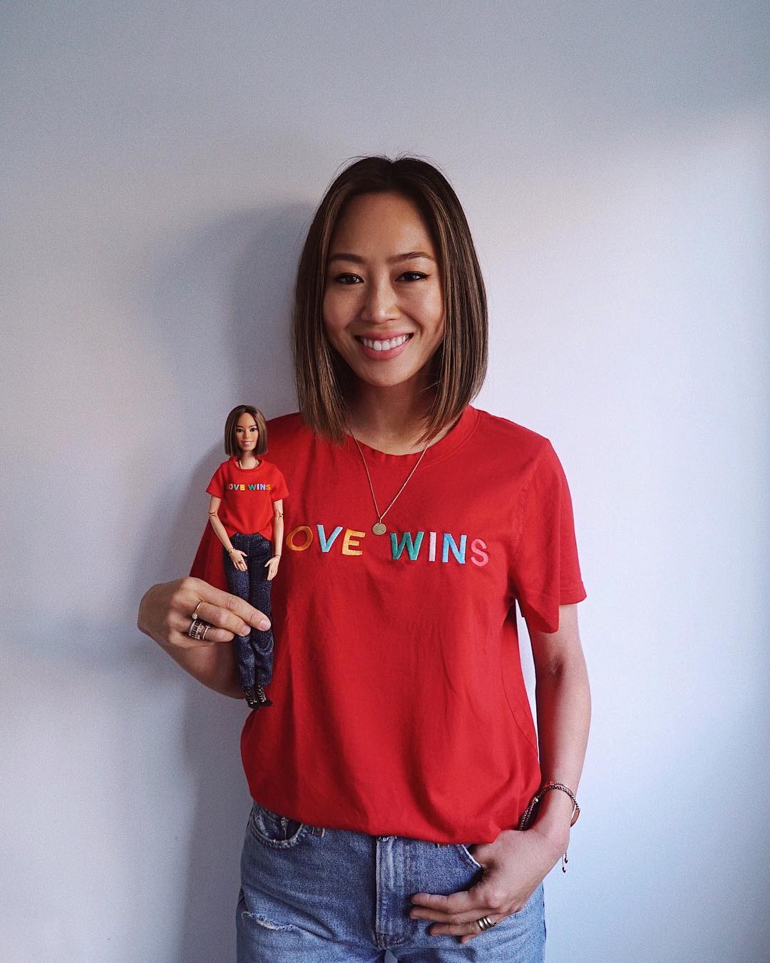 E fê-lo com recurso à boneca de Aimee Song, que popularizou uma camisola a dizer ‘Love Wins’ (O Amor Vence) durante o mês do Orgulho Gay e que visa financiar organizações de jovens LGBT, e a uma boneca loira.