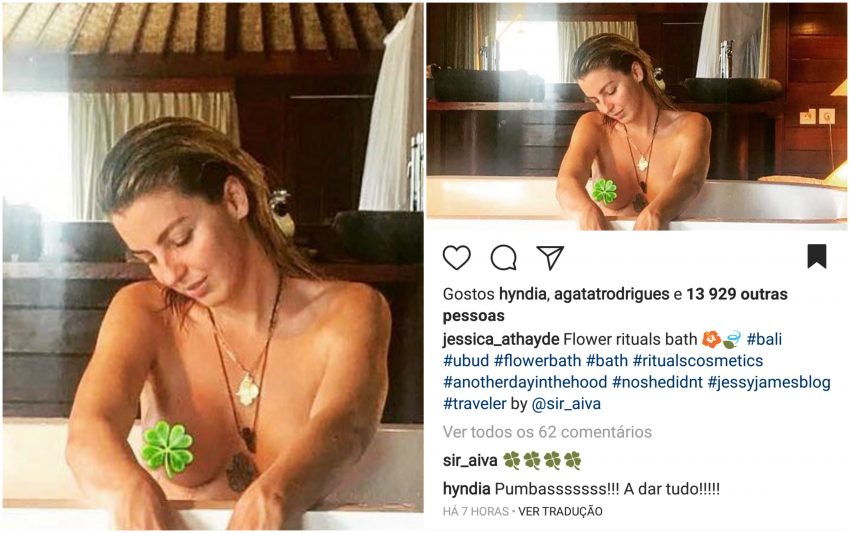 Esta demonstração de ousadia e confiança no seu corpo foi logo comentada pela amiga Rita Pereira: “Pumbasssssss!!! A dar tudo”. Ora, o amigo a quem Jessica tem mostrado aquele local paradisíaco e que terá feito o disparo que garantiu a fotografia de que tanto se fala, também comentou a publicação com desenhos de trevos.