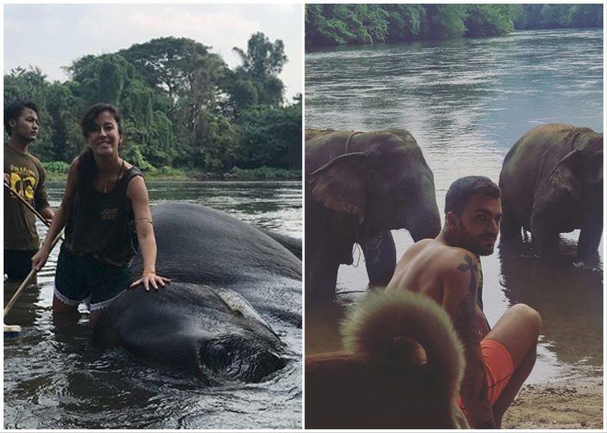 Em Kanchanaburi, no Campo dos Elefantes (Elephants World), o casal deu banho aos animais que dão nome ao parque natural, além de ter apanhado milho para os alimentar, metendo assim mãos aos hábitos locais.