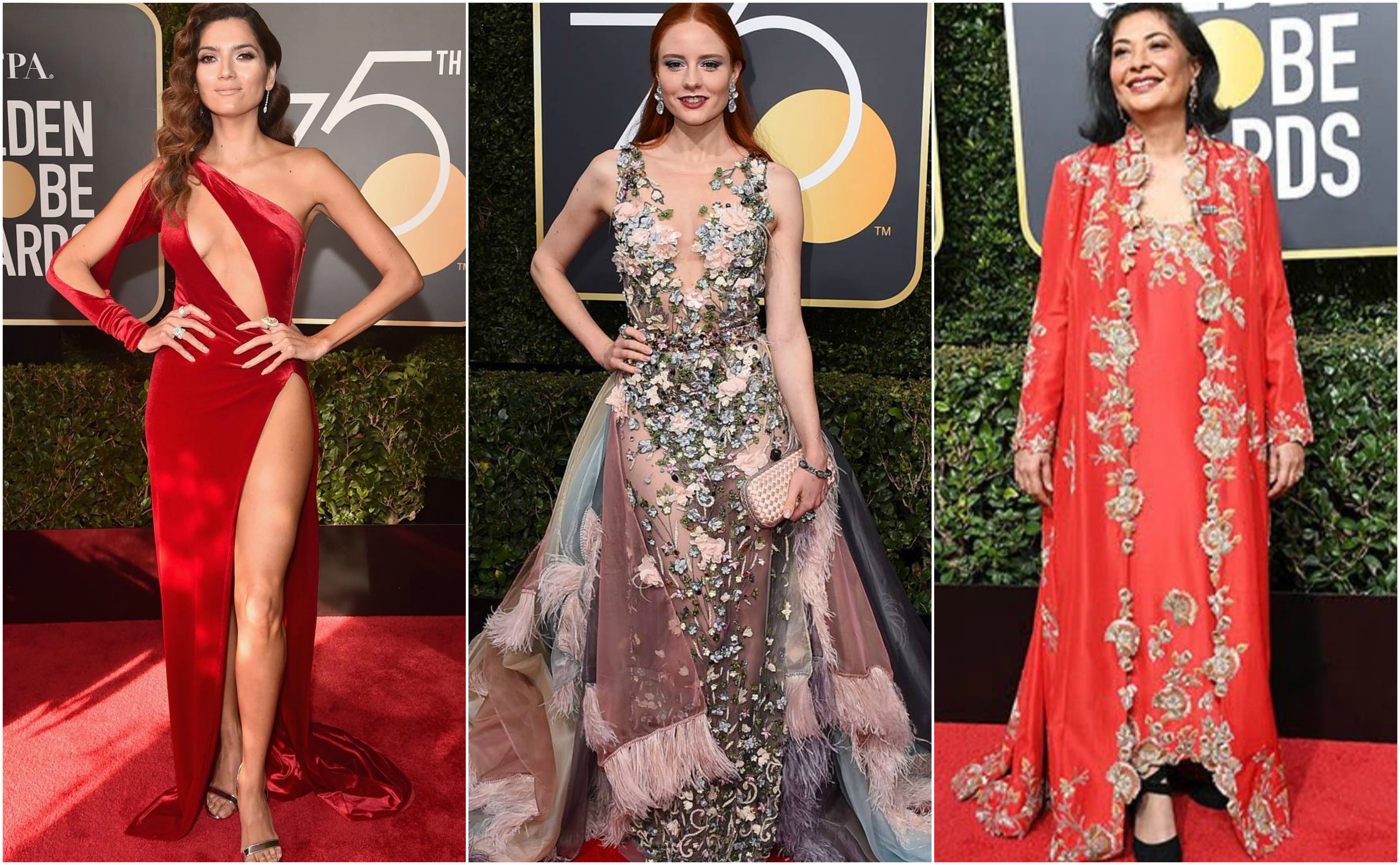 Quem também chamou a atenção por desfilar um brilhante vestido vermelho foi a indiana Meher Tatna, presidente da Associação dos Correspondentes Estrangeiros de Hollywood.