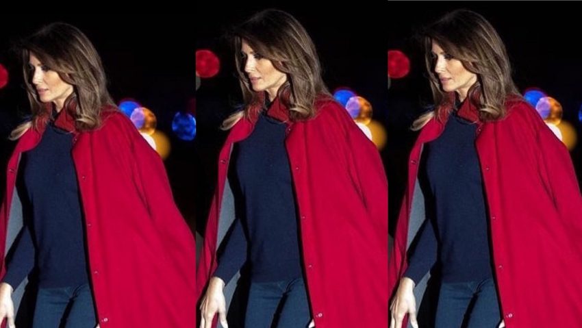 Com uma sweat em azul-marinho, uns jeans da mesma cor e um casaco vermelho da Maison Ullens o look de Melania está a ser muito elogiado.