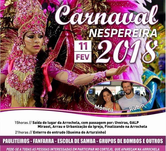 Mónica Sofia e o marido Rubim Fonseca são os reis do Carnaval de Nespereira, freguesia de Guimarães. O casal irá desfilar a partir das 15h00 numa festa que contará também com a presença de pauliteiros, fanfarras, escola de samba, grupos de bombos entre outros.