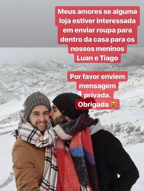 “Meus amores se alguma loja estiver interessada em enviar roupa para dentro da casa para os nossos meninos Luan e Tiago por favor enviem mensagem privada. Obrigada”, pediu no Instagram, onde tem mais de 221 mil seguidores.