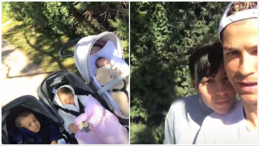Esta quarta-feira, Cristiano Ronaldo mostrou-se a passear com a namorada, Georgina Rodríguez, e os filhos mais novos, os gémeos Eva Maria e Mateos, de nove meses, e Alana Martina, de quatro meses, num “passeio matinal” pela urbanização La Finca, onde vivem.