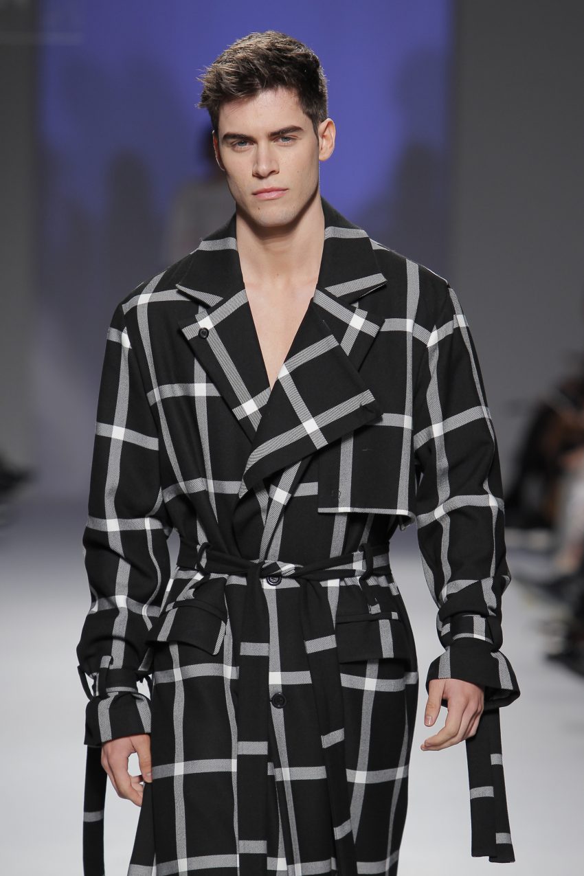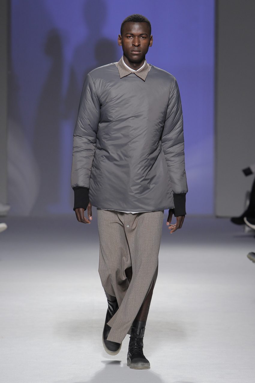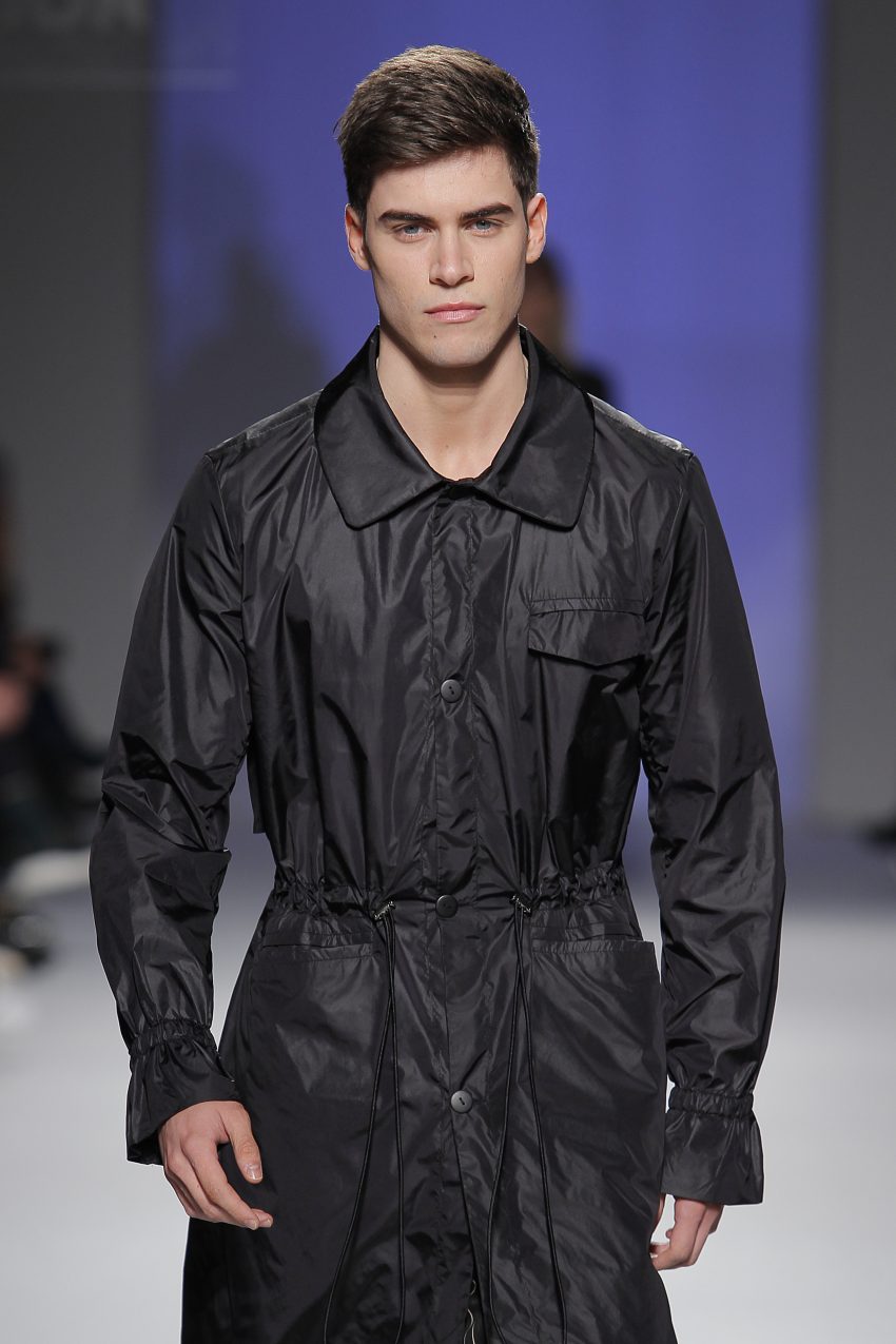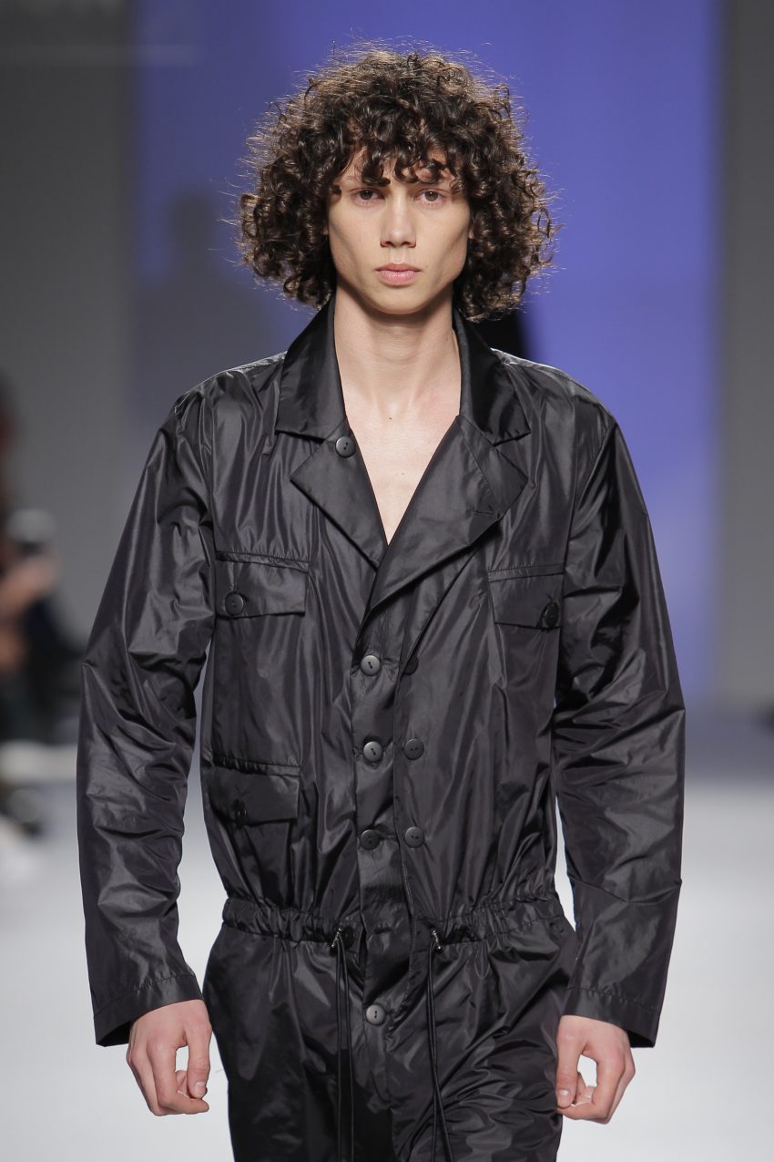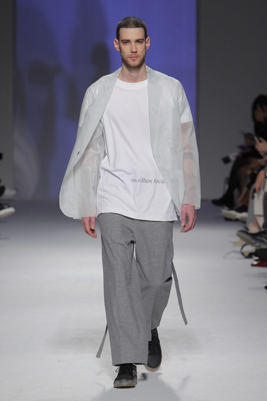 “Acaba por ser uma coleção no seguimento das outras, mas um bocadinho mais experimental. Mantenho a mesma linha do clássico, da parte de homem, da alfaiataria, mas depois também tenho alguns materiais mais técnicos como o nylon que nunca tinha usado”, começou por explicar, depois da estreia no palco dos grandes.