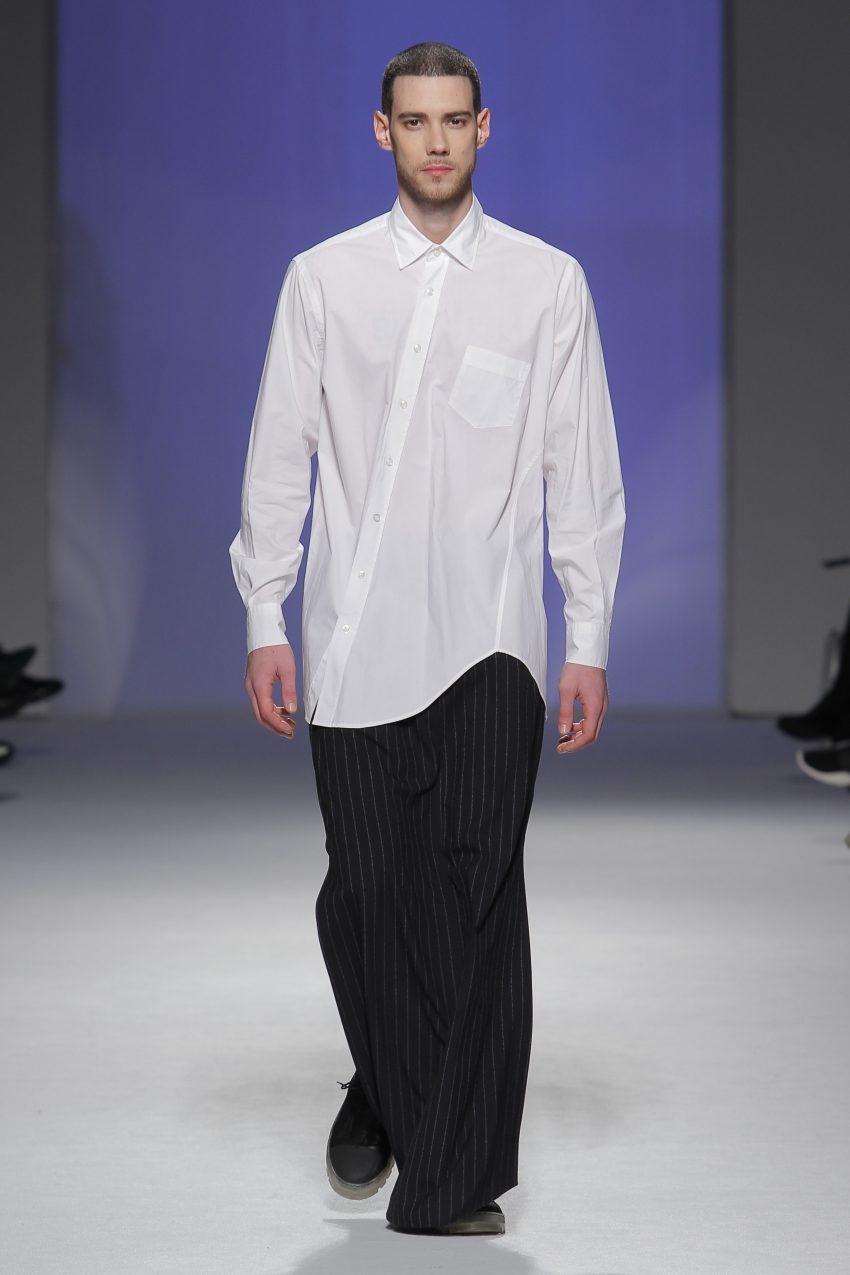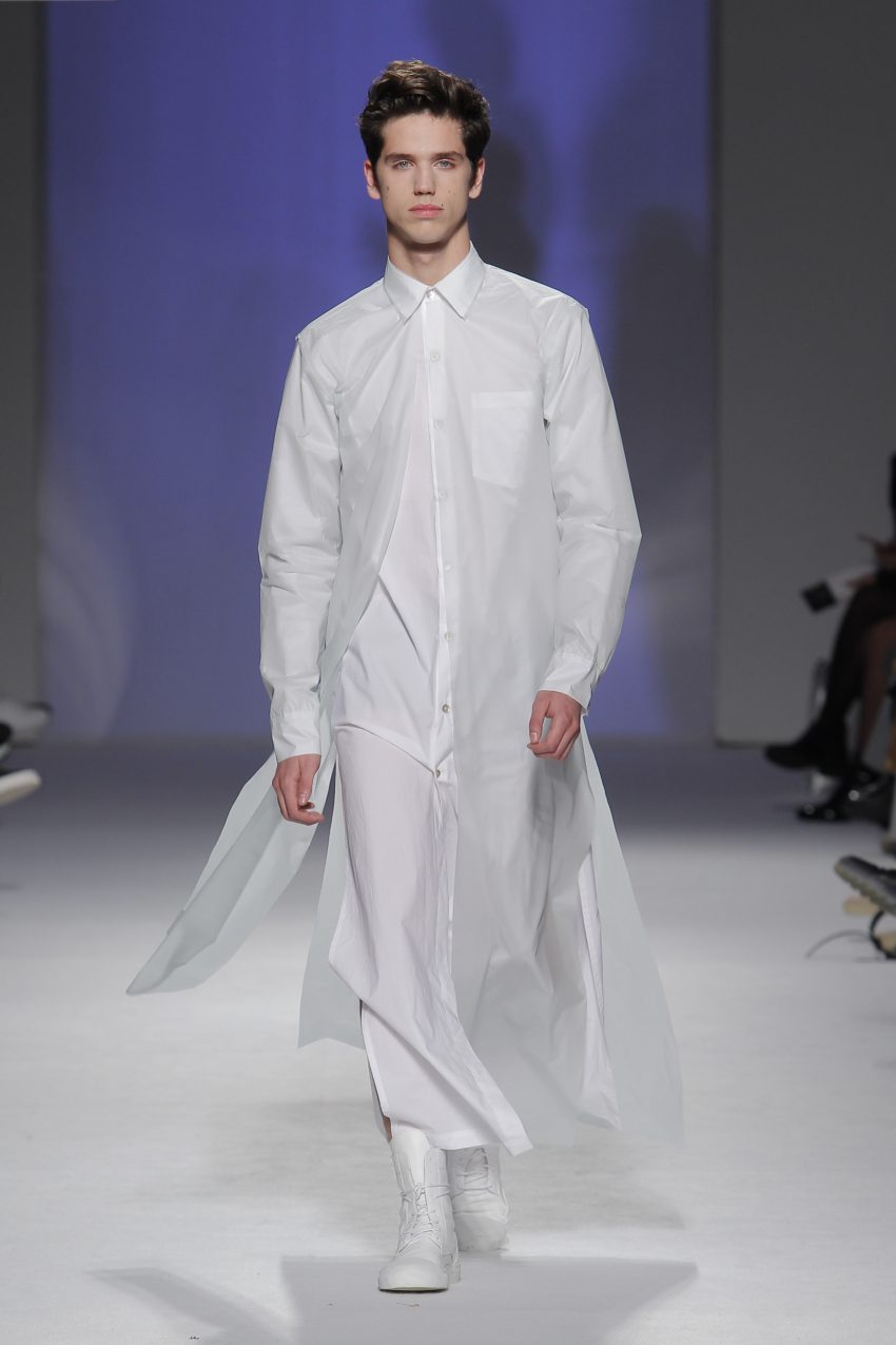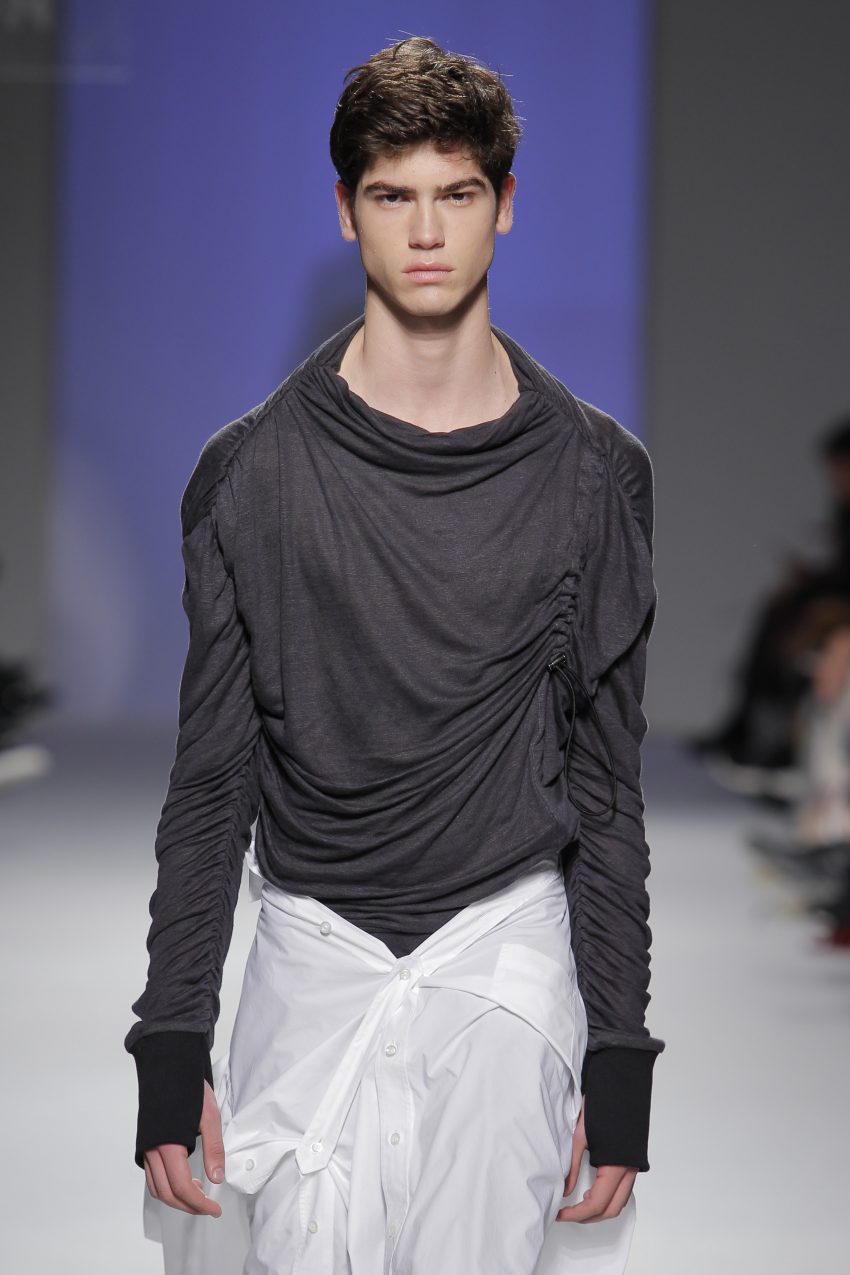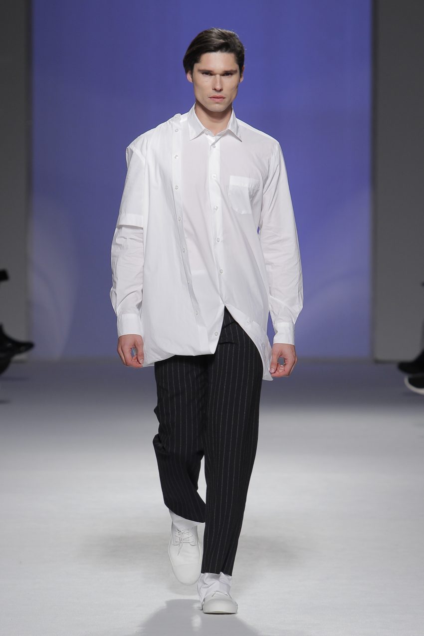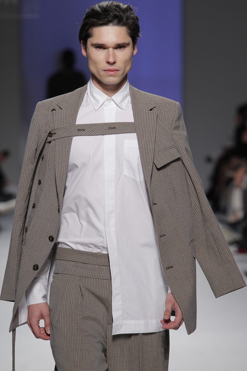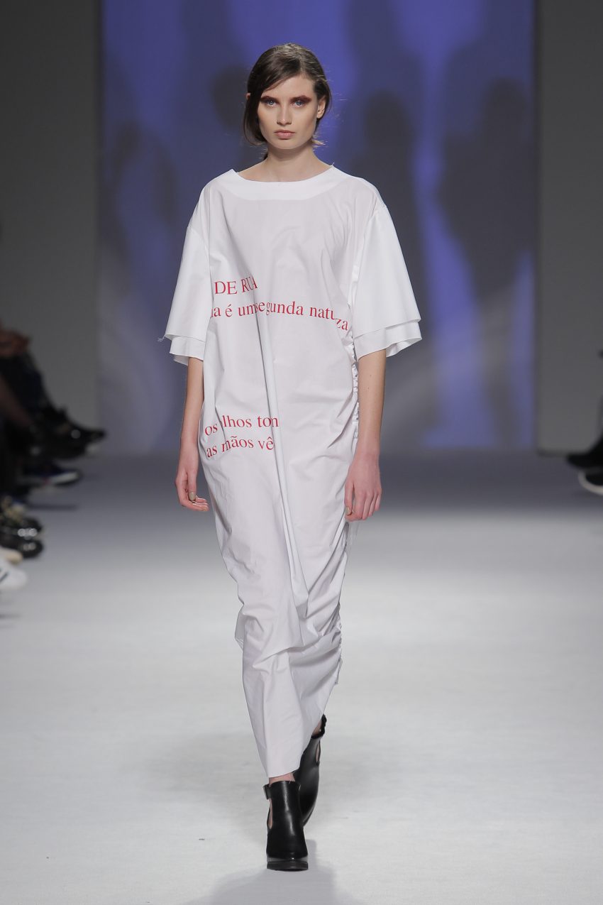 “Acaba por ser uma coleção no seguimento das outras, mas um bocadinho mais experimental. Mantenho a mesma linha do clássico, da parte de homem, da alfaiataria, mas depois também tenho alguns materiais mais técnicos como o nylon que nunca tinha usado”, começou por explicar, depois da estreia no palco dos grandes.