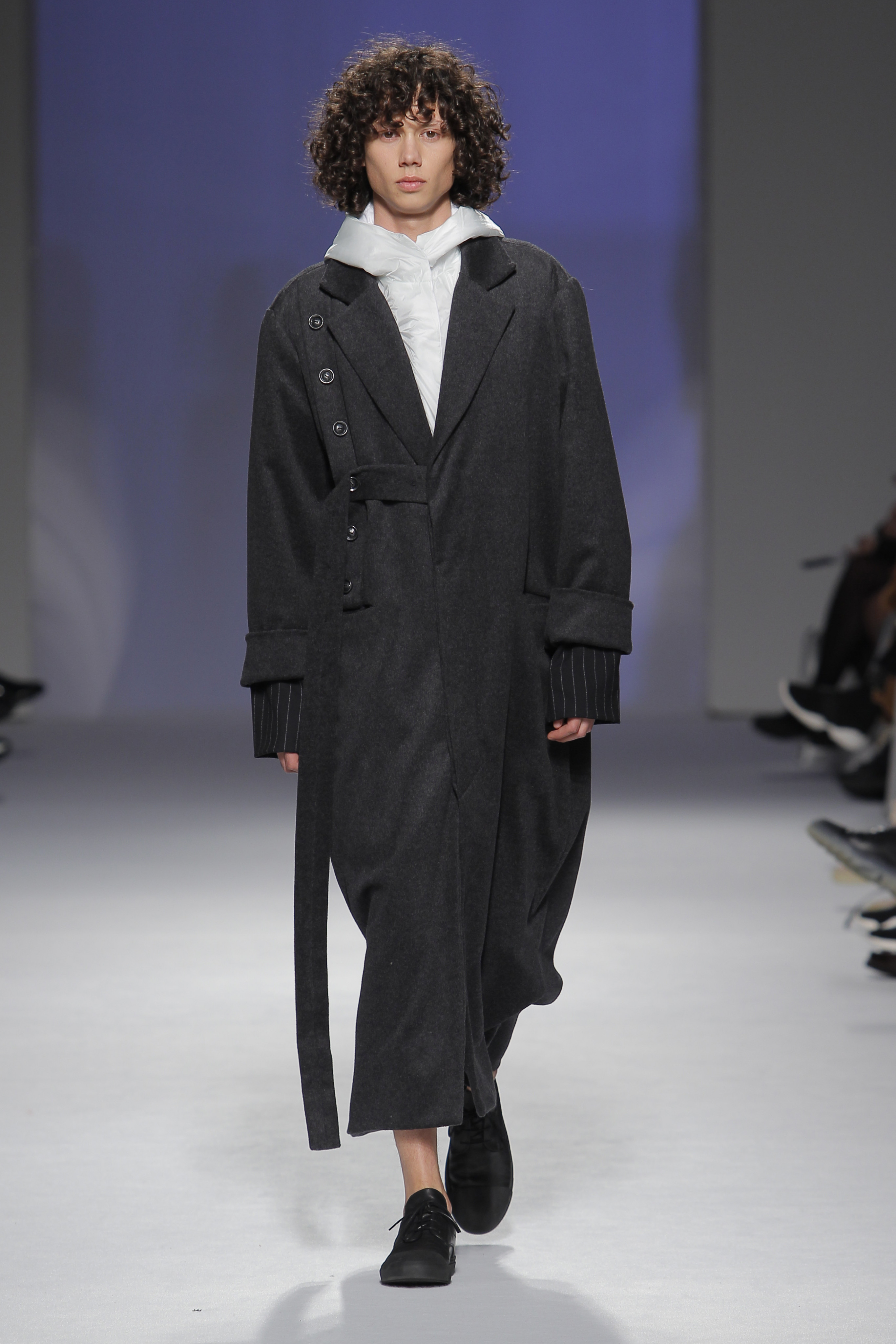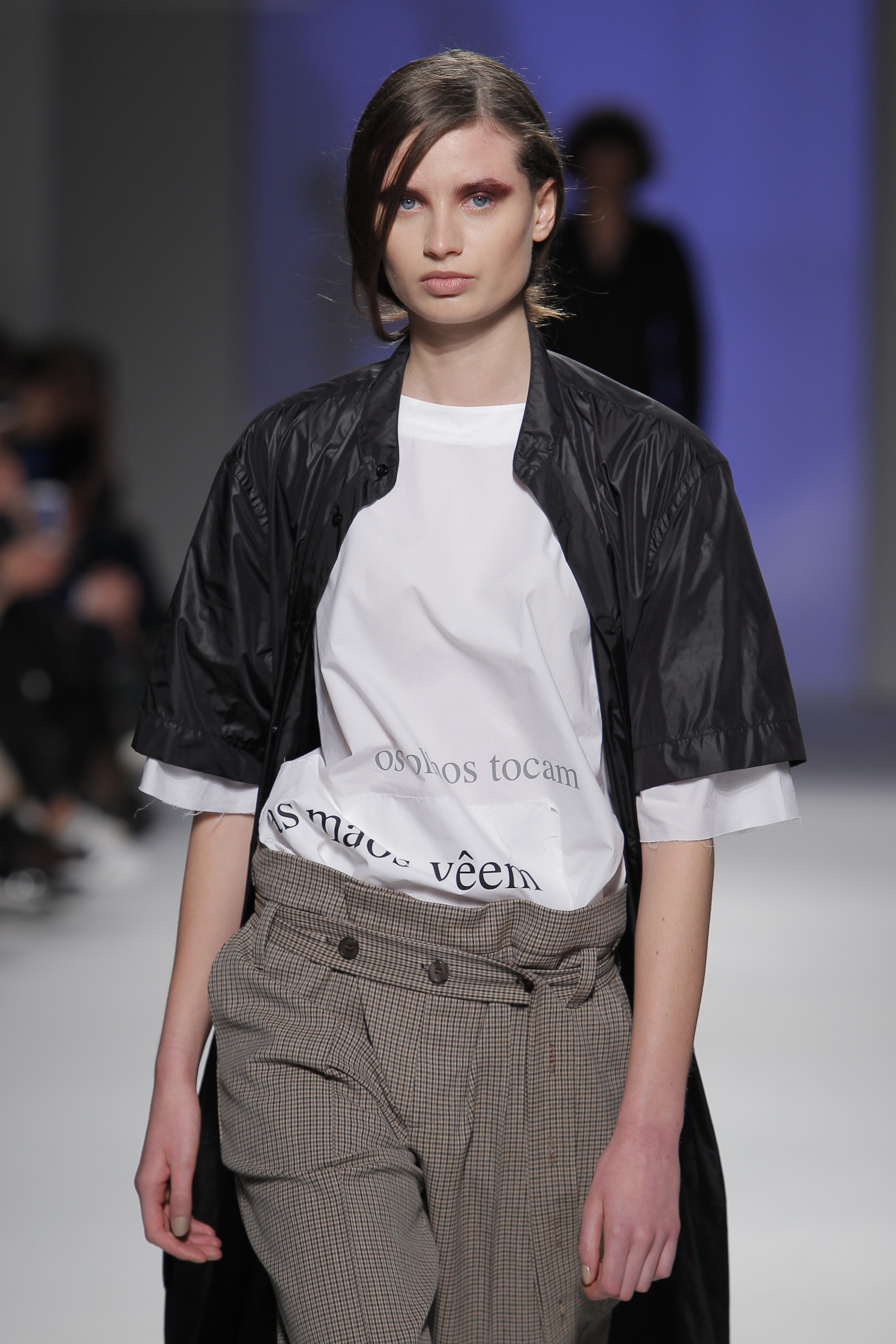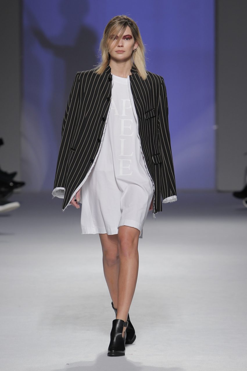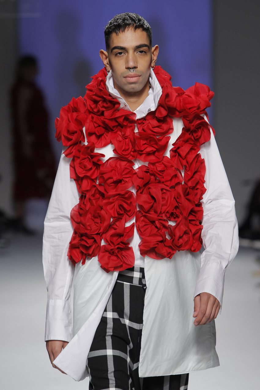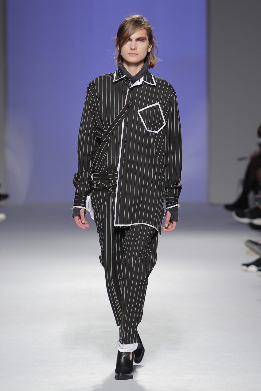 “Acaba por ser uma coleção no seguimento das outras, mas um bocadinho mais experimental. Mantenho a mesma linha do clássico, da parte de homem, da alfaiataria, mas depois também tenho alguns materiais mais técnicos como o nylon que nunca tinha usado”, começou por explicar, depois da estreia no palco dos grandes.
