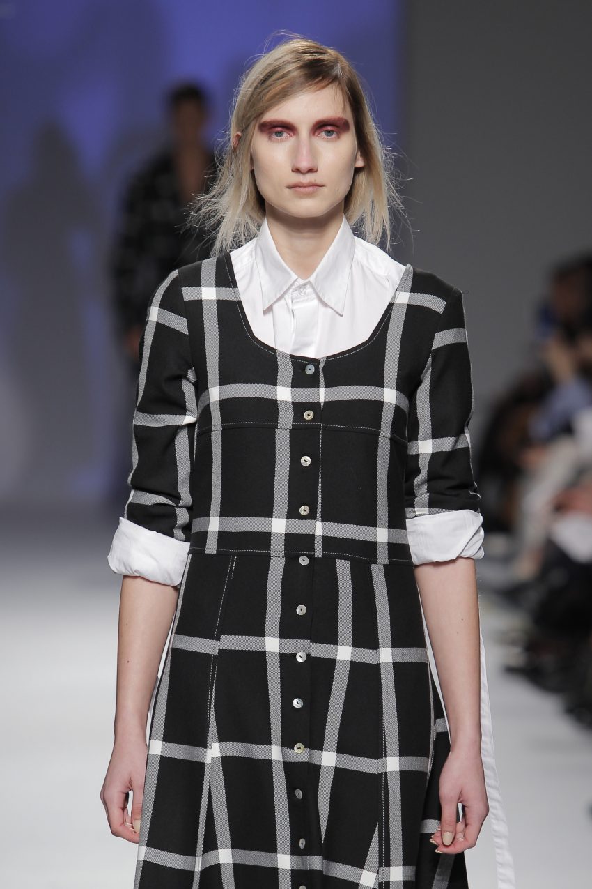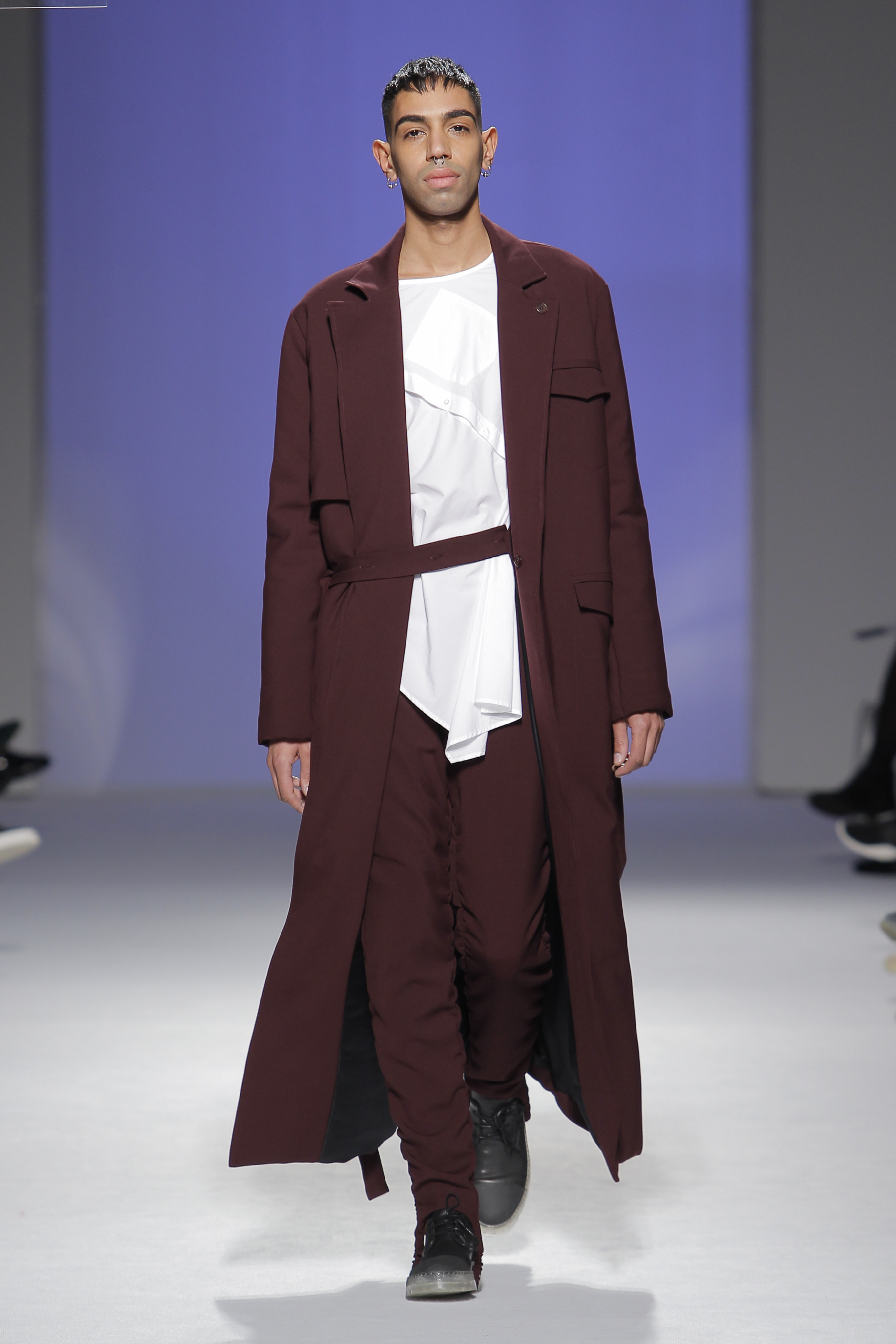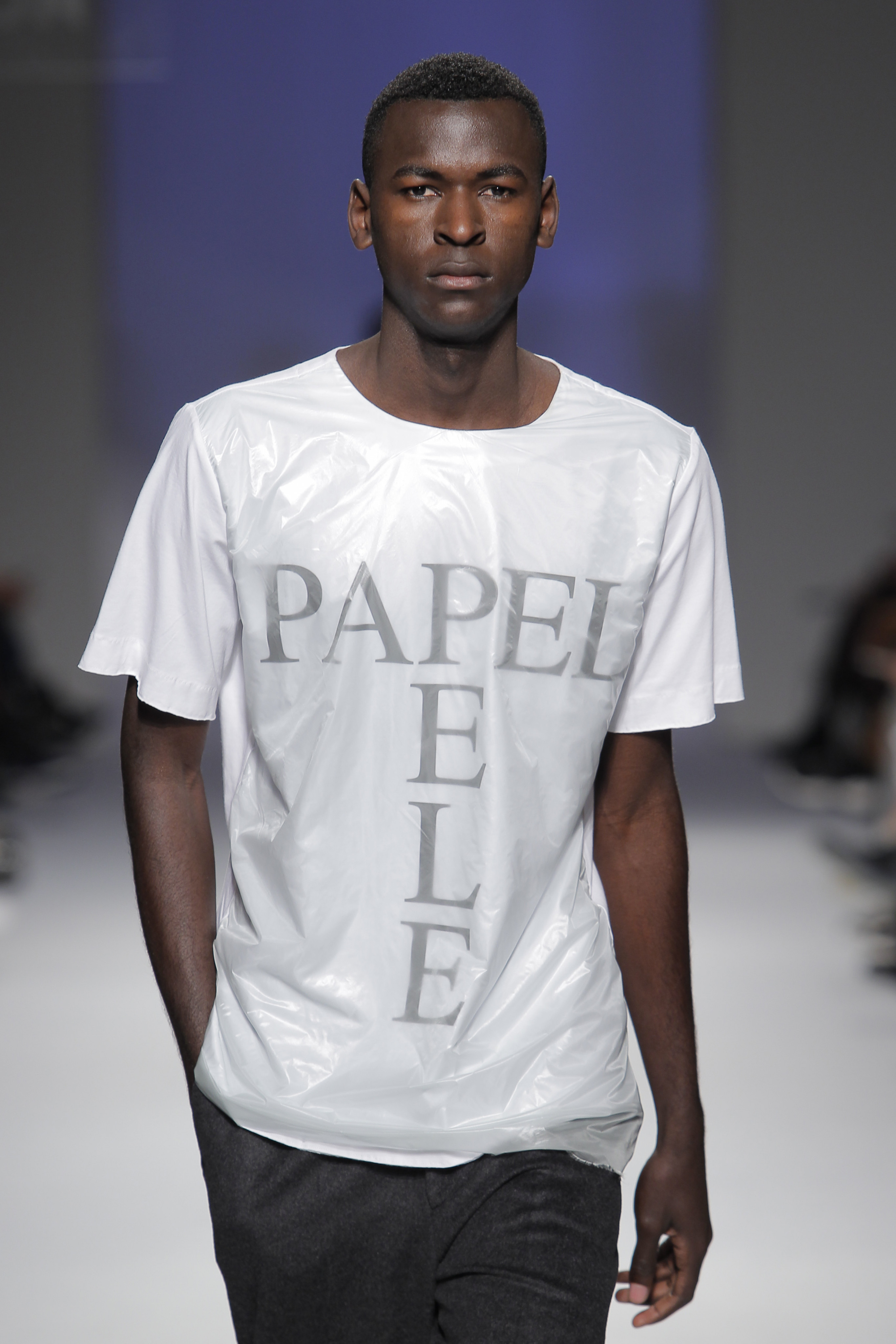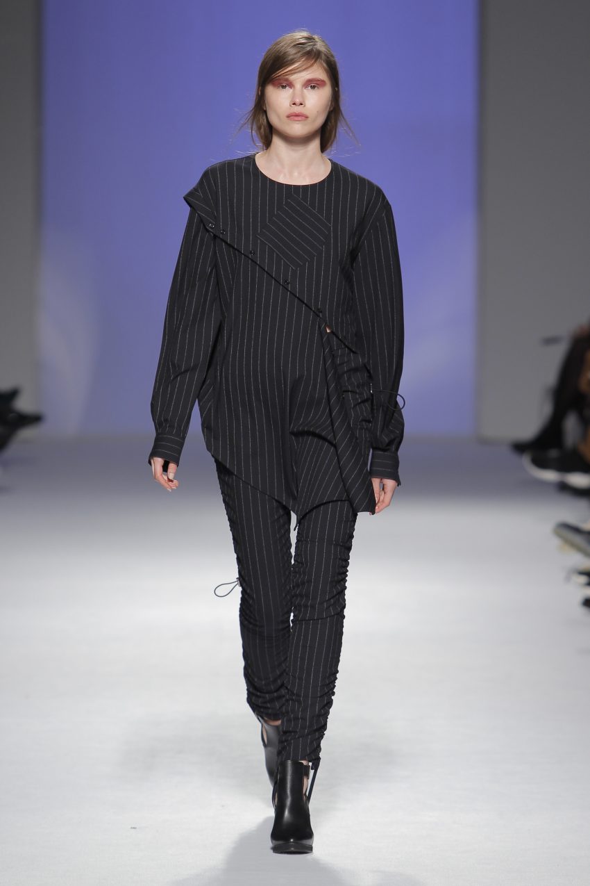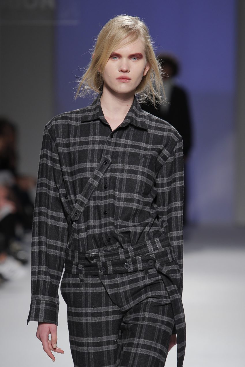 “Acaba por ser uma coleção no seguimento das outras, mas um bocadinho mais experimental. Mantenho a mesma linha do clássico, da parte de homem, da alfaiataria, mas depois também tenho alguns materiais mais técnicos como o nylon que nunca tinha usado”, começou por explicar, depois da estreia no palco dos grandes.