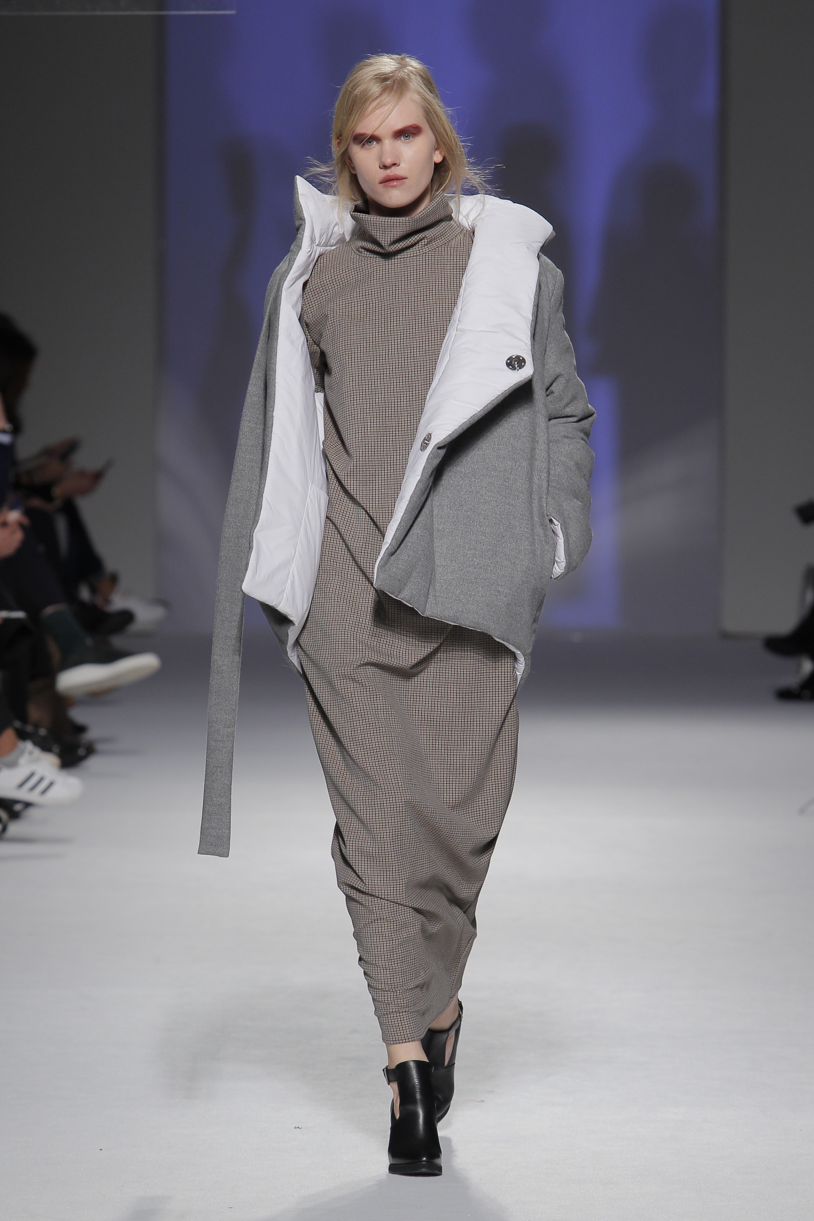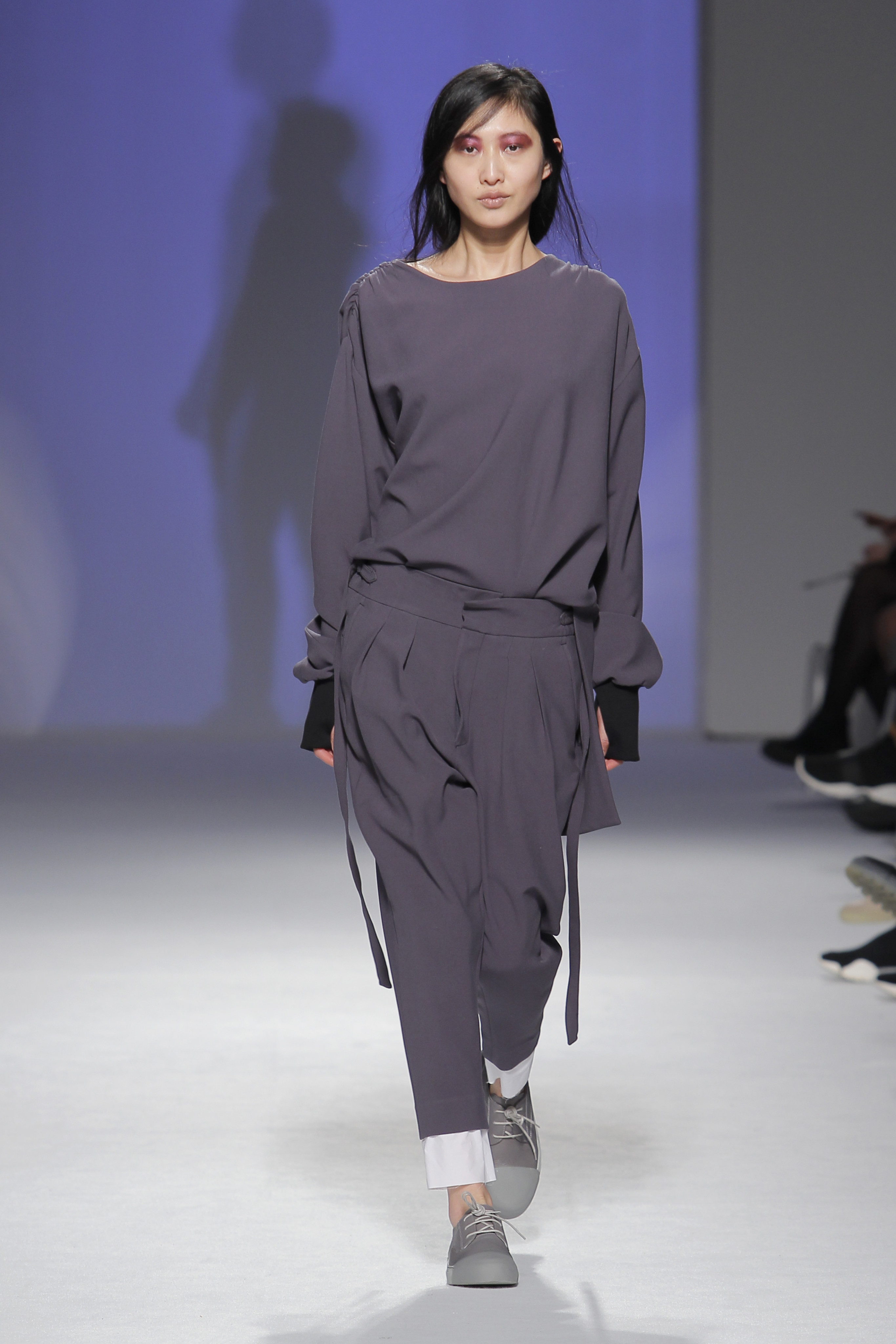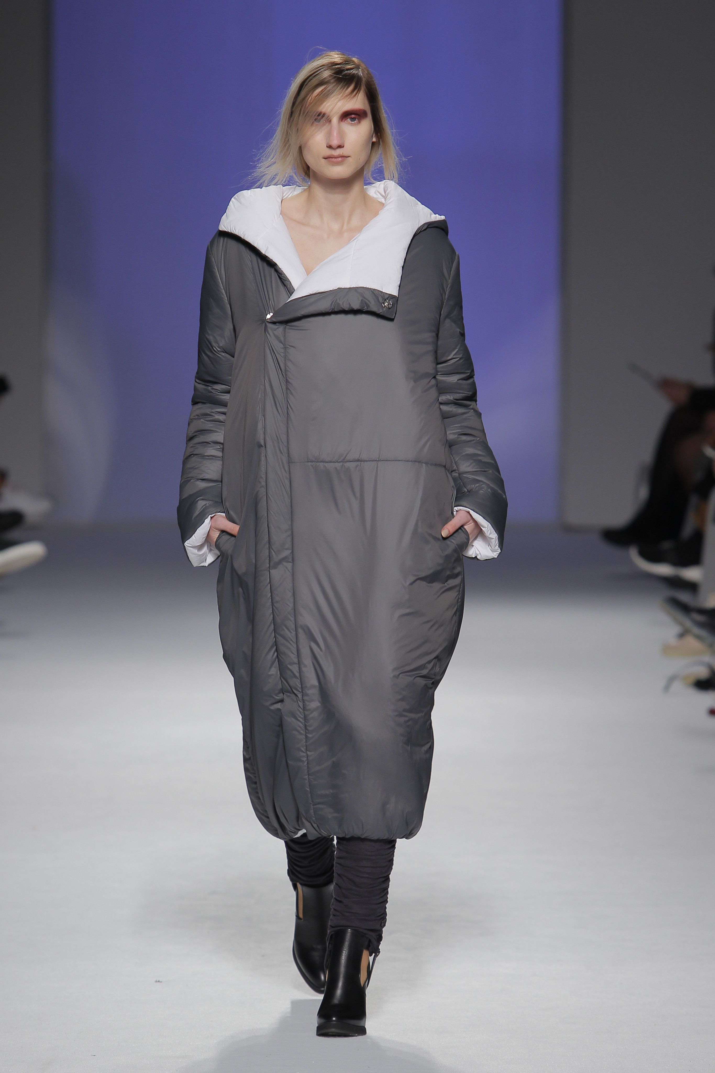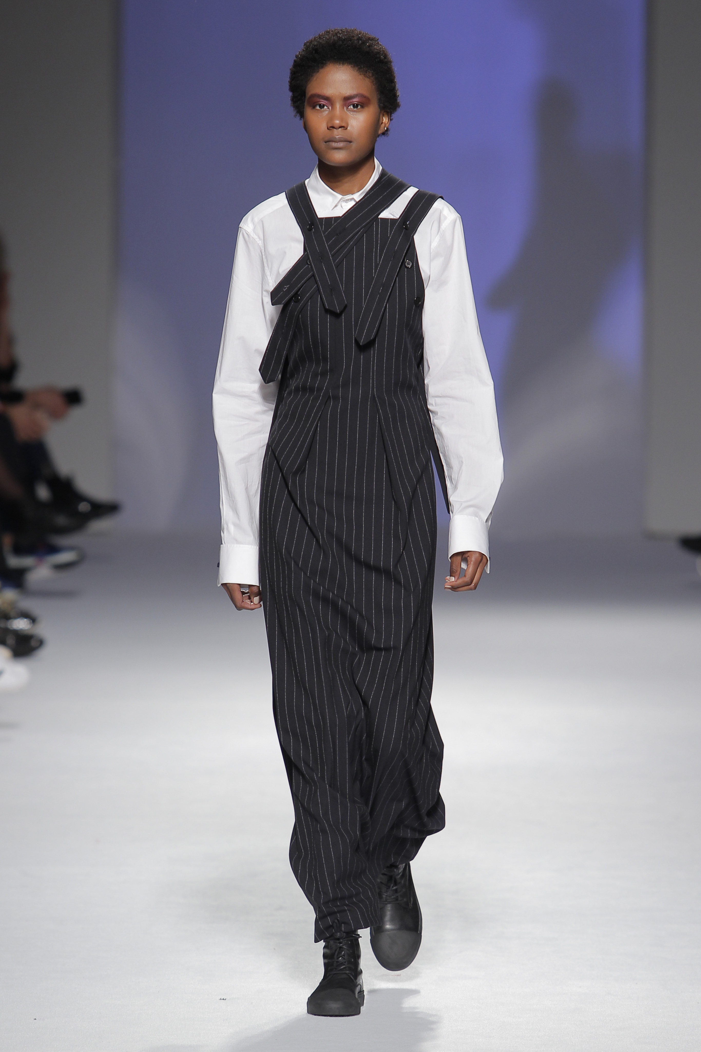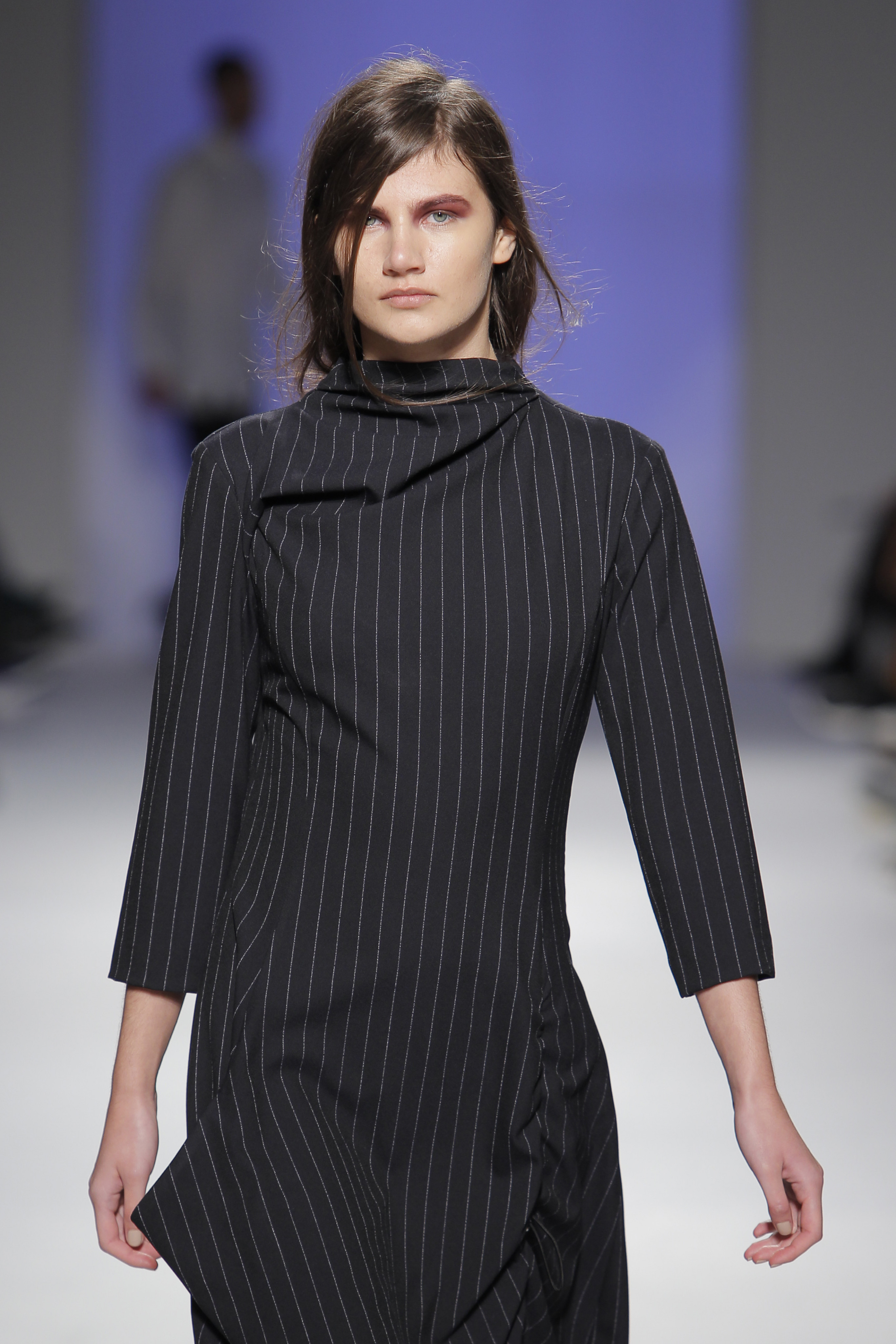 “Acaba por ser uma coleção no seguimento das outras, mas um bocadinho mais experimental. Mantenho a mesma linha do clássico, da parte de homem, da alfaiataria, mas depois também tenho alguns materiais mais técnicos como o nylon que nunca tinha usado”, começou por explicar, depois da estreia no palco dos grandes.