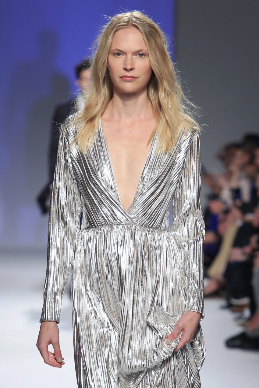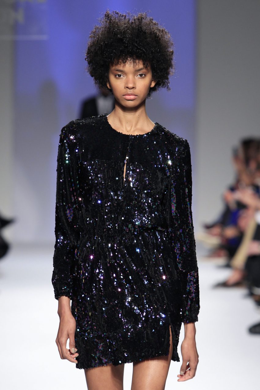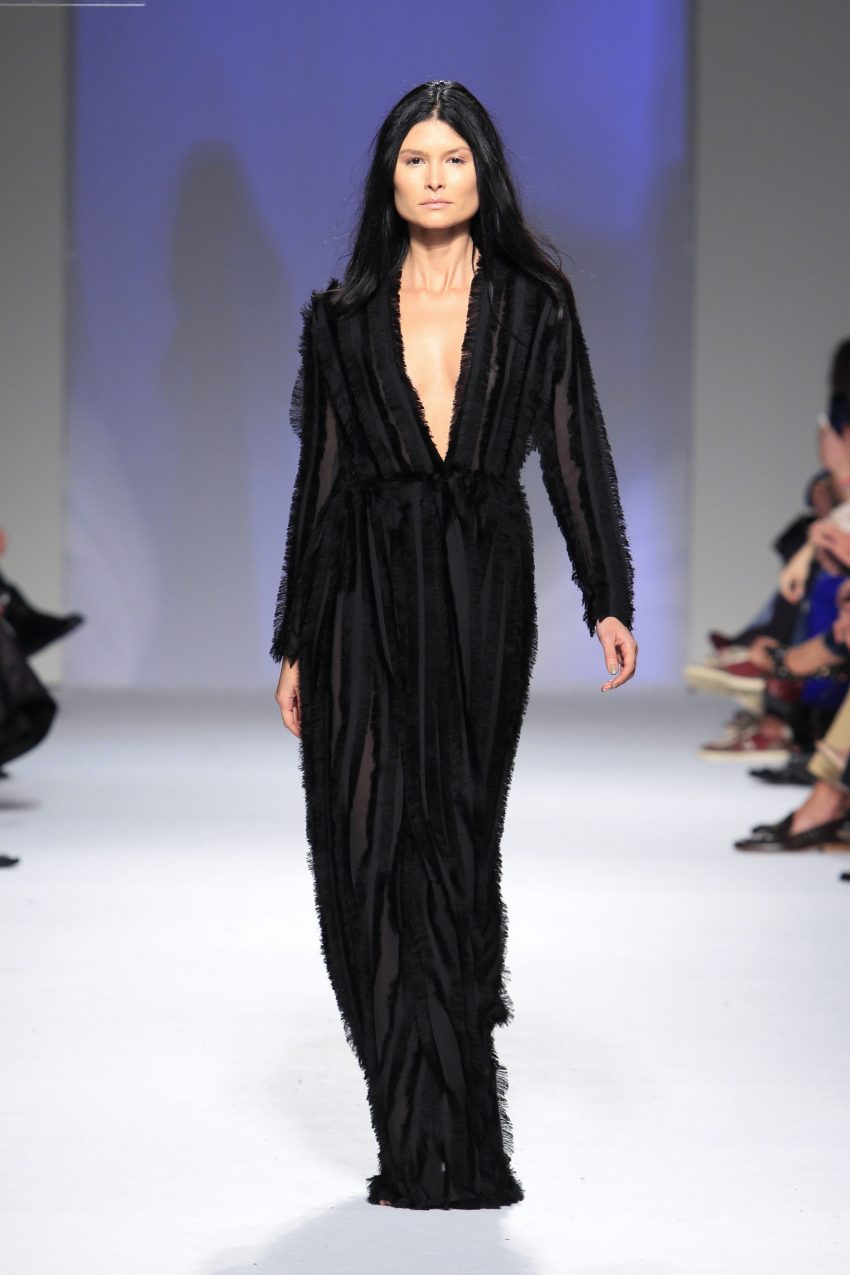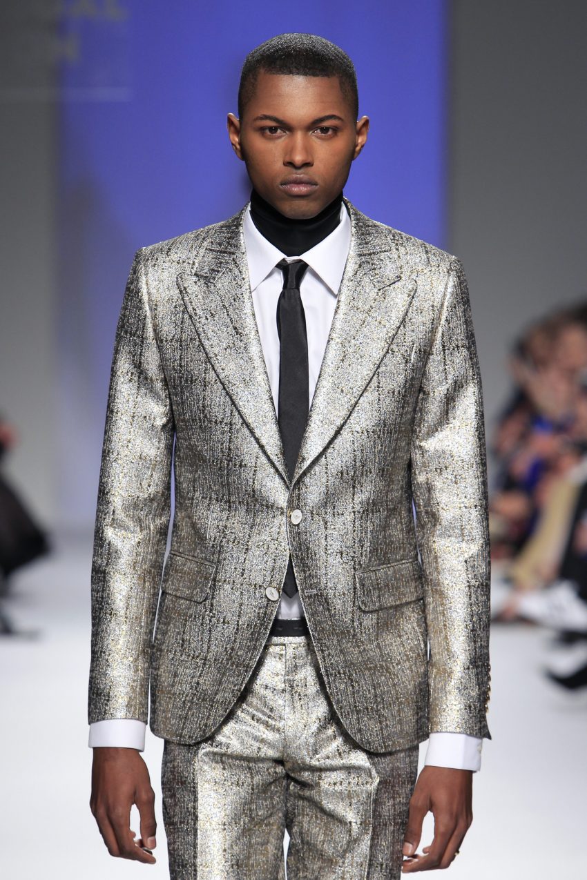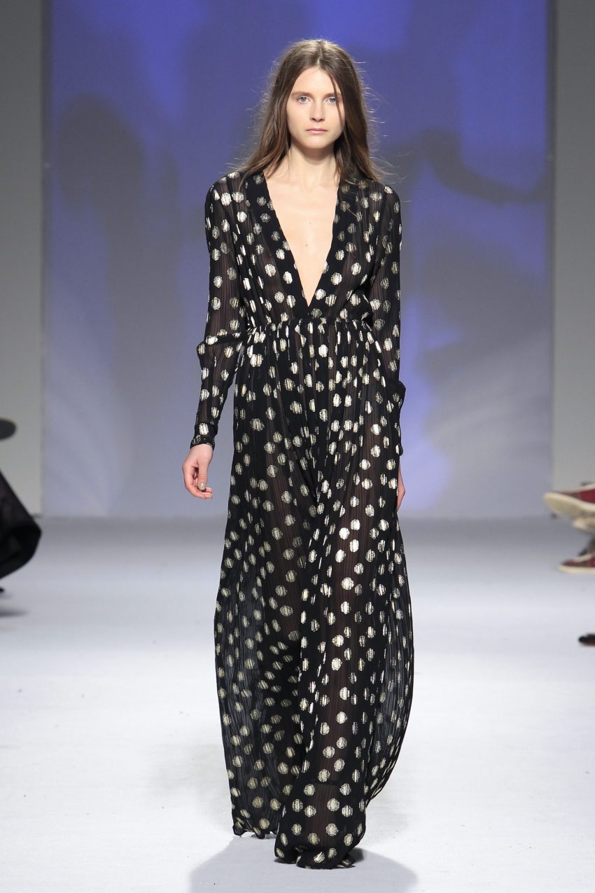 Miguel ousou na mistura de materiais, conjugando estampados em flocado com fazendas, pelo, lantejoulas, napas, tecidos laminados e plissados, com os acessórios também em grande destaque.
