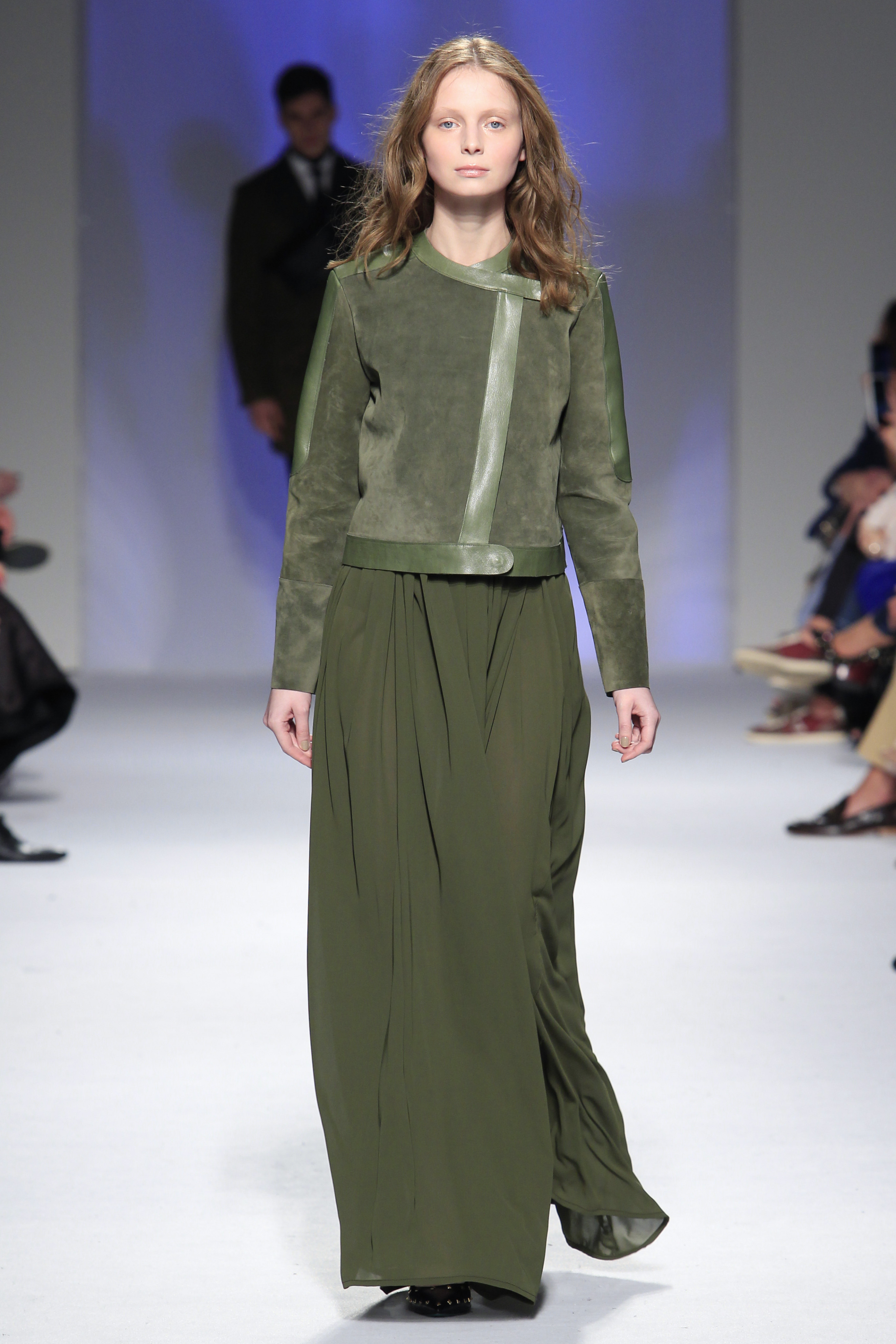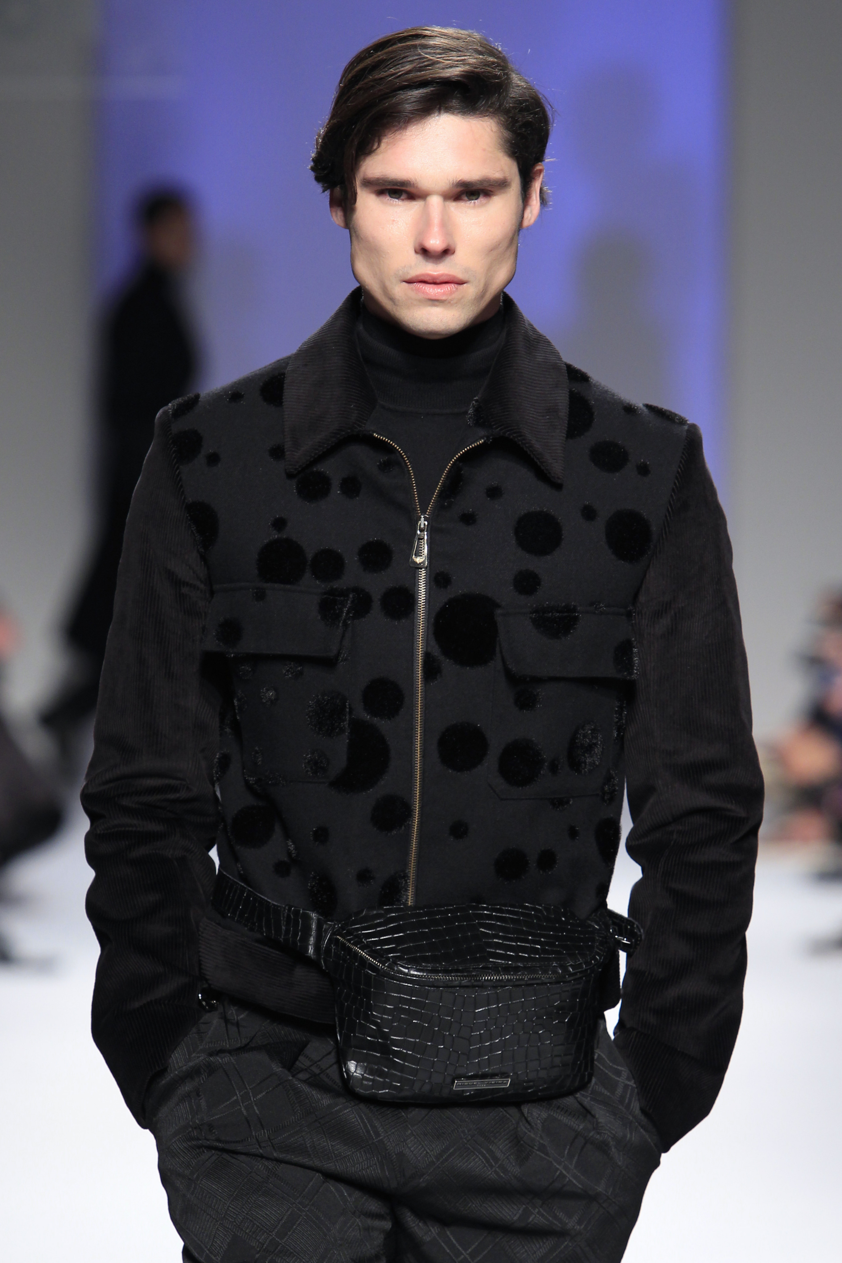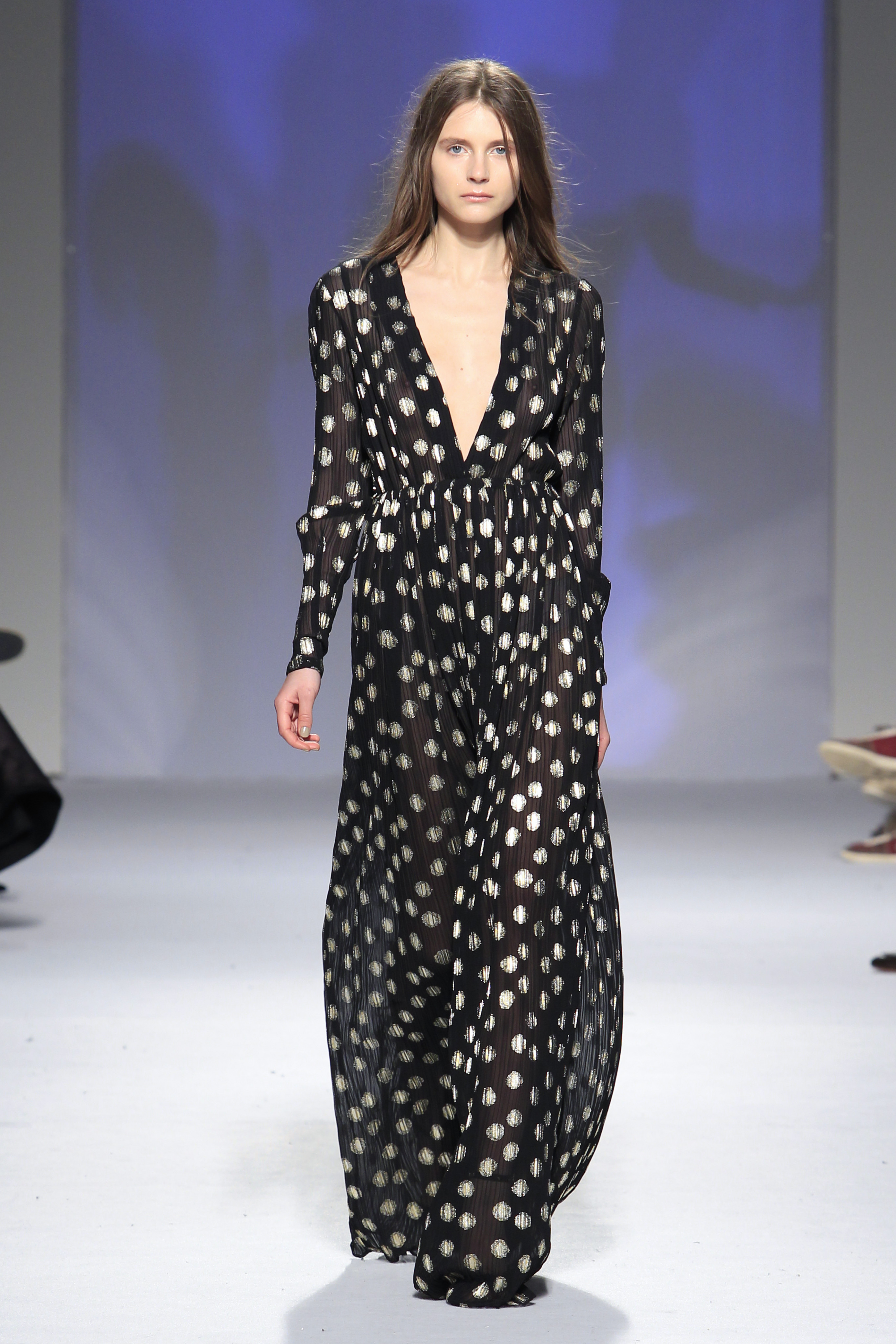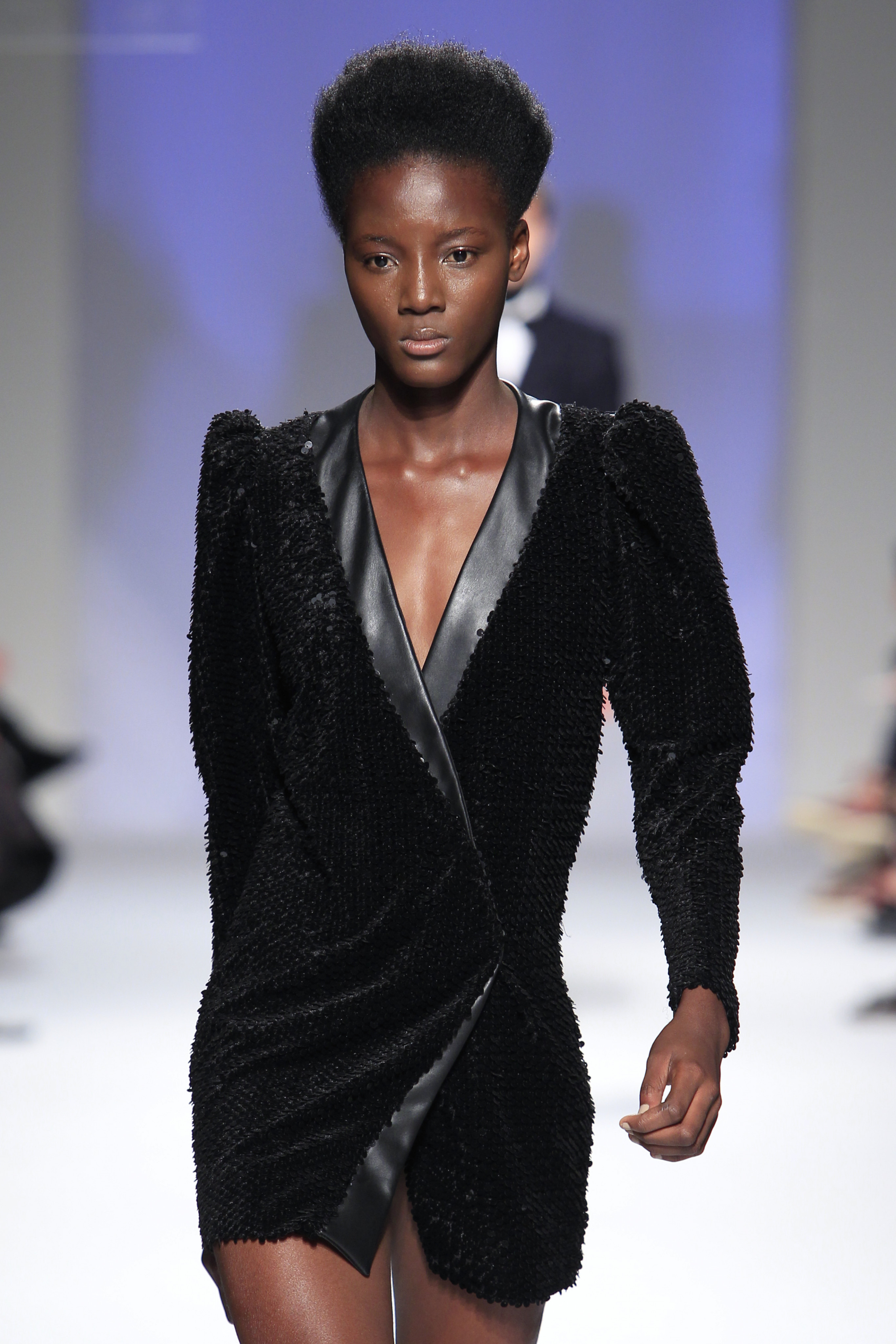 Miguel ousou na mistura de materiais, conjugando estampados em flocado com fazendas, pelo, lantejoulas, napas, tecidos laminados e plissados, com os acessórios também em grande destaque.