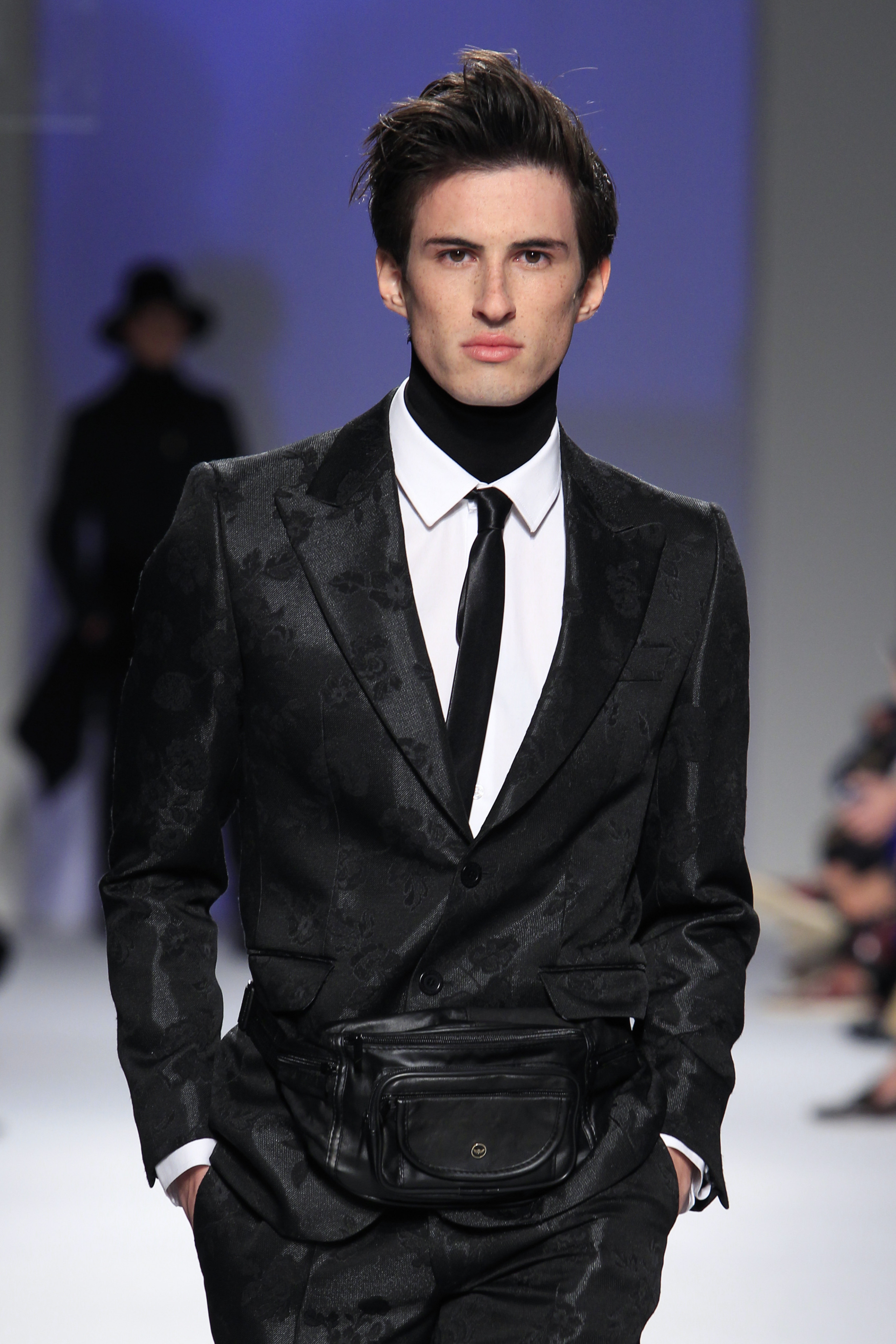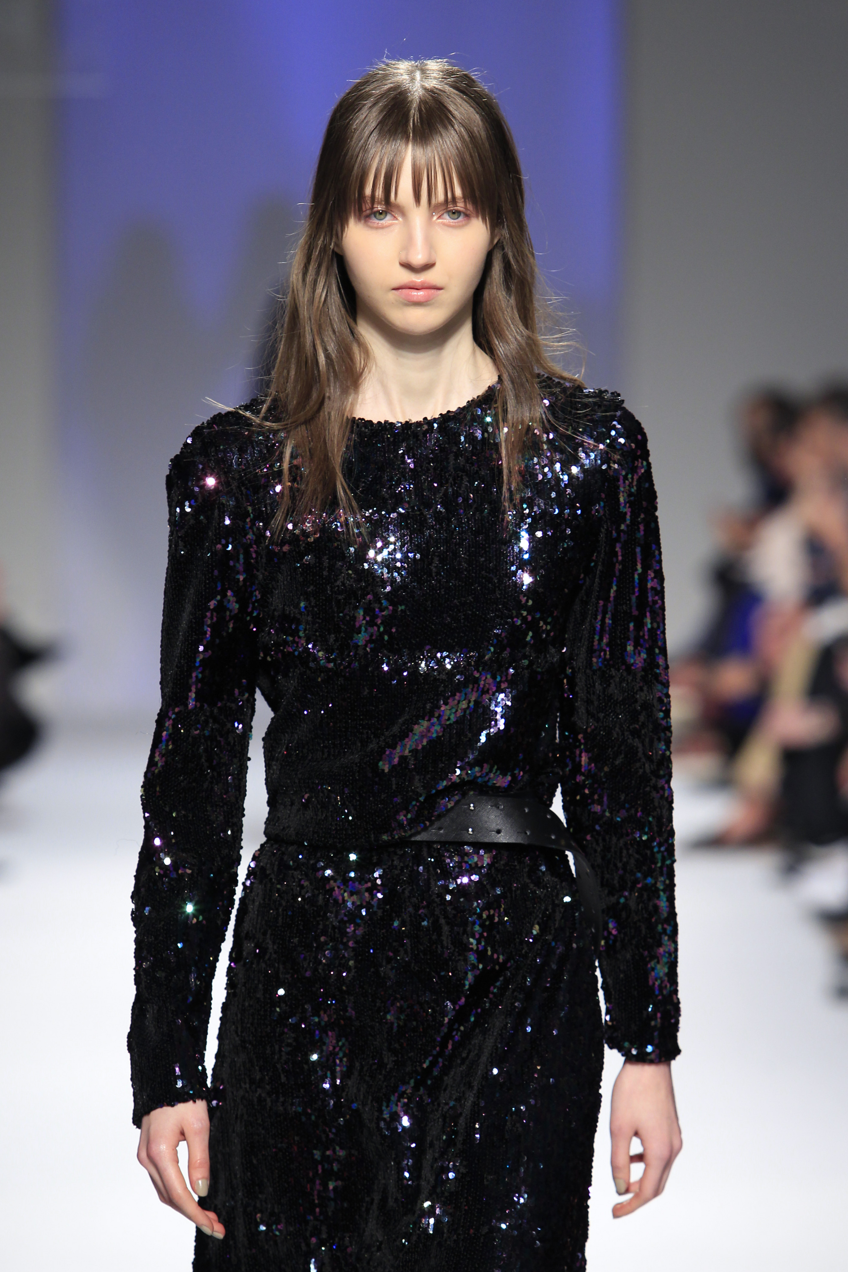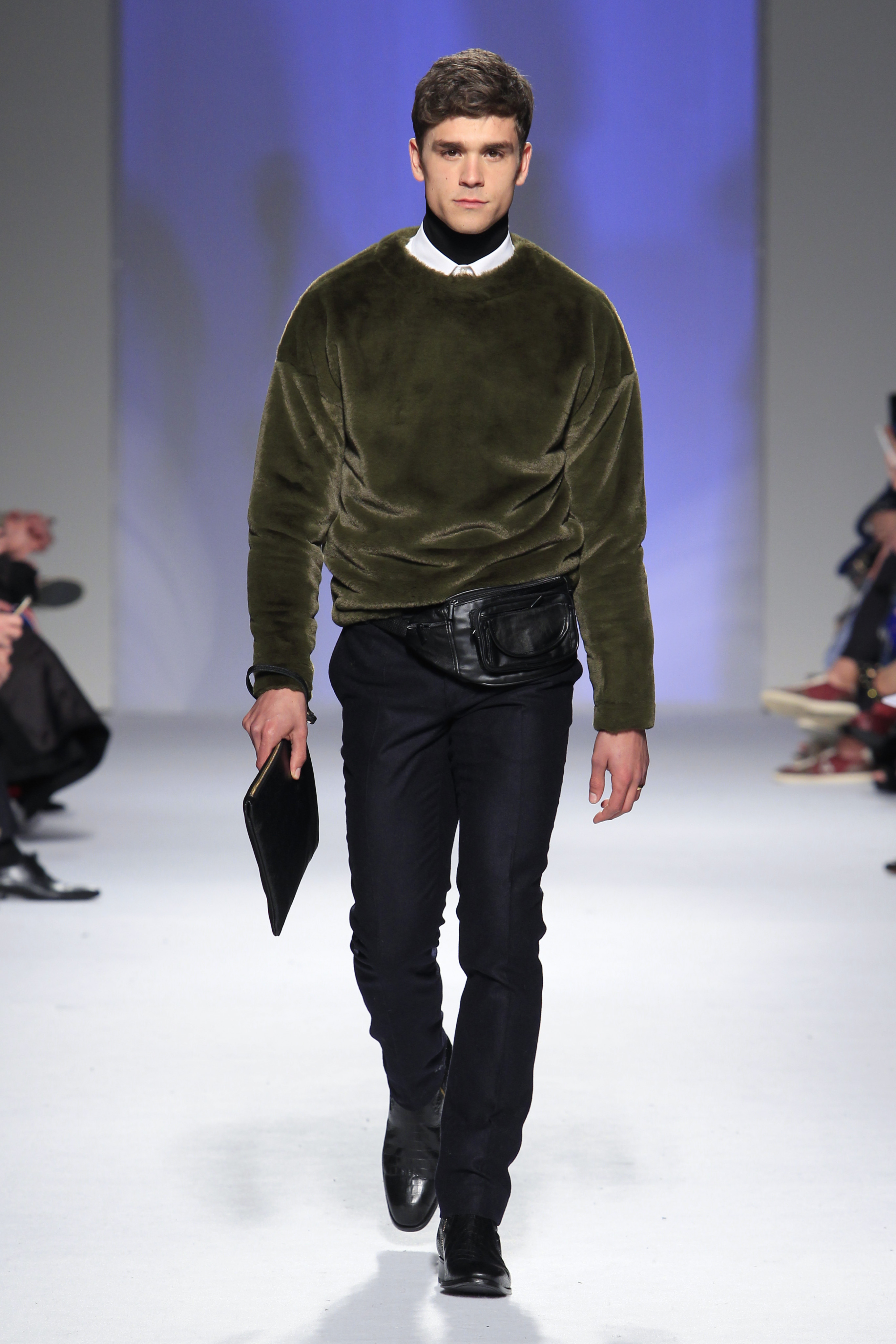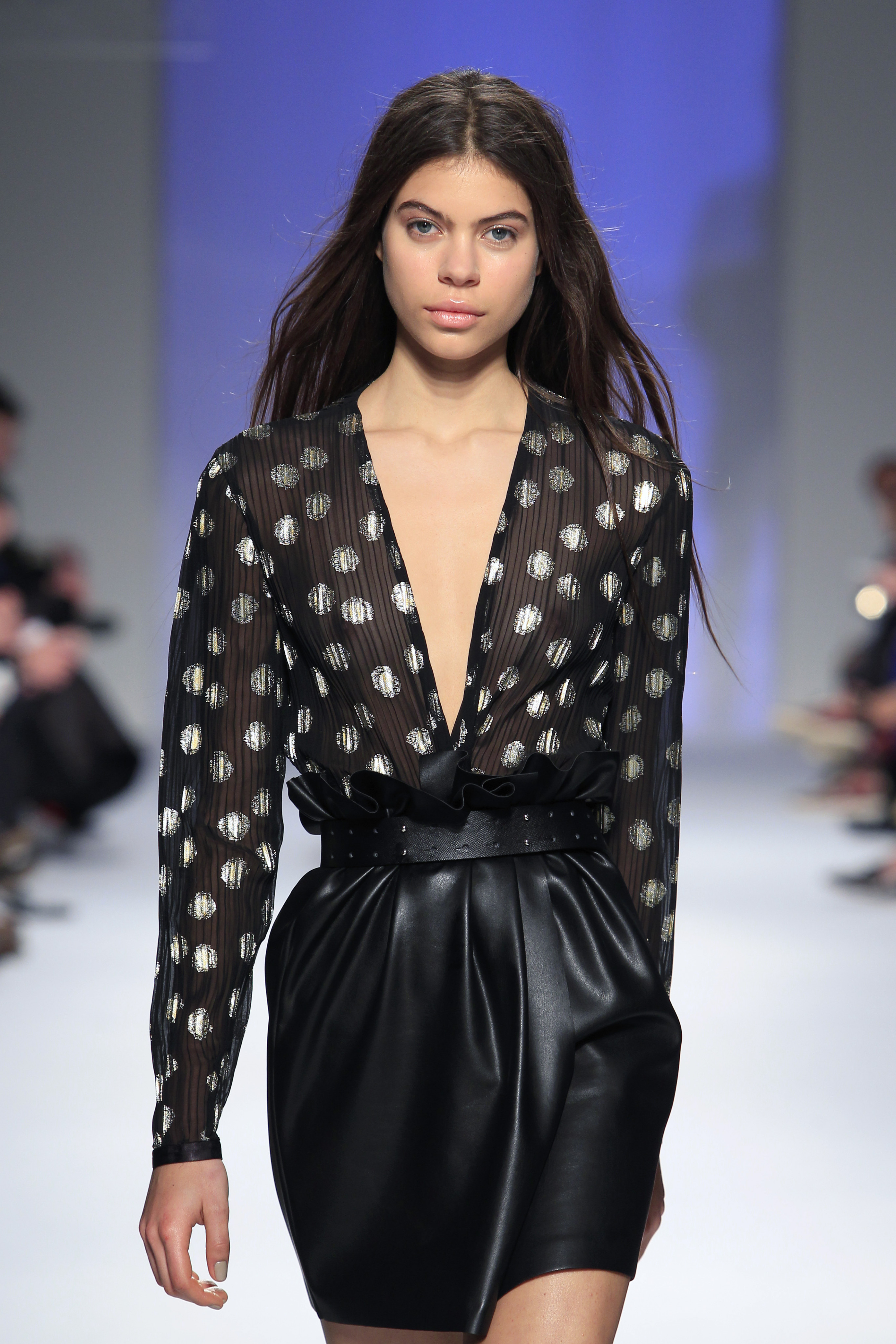 Miguel ousou na mistura de materiais, conjugando estampados em flocado com fazendas, pelo, lantejoulas, napas, tecidos laminados e plissados, com os acessórios também em grande destaque.