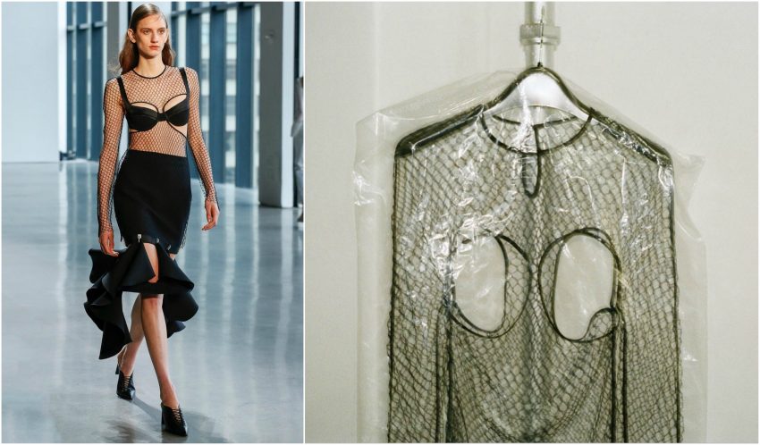 O designer australiano Dion Lee foi um dos que pegou nesse conceito e aplicou-o em blazers com o tal formato do aro debaixo do peito e, por vezes, com uma pequena abertura em cima de cada seio.