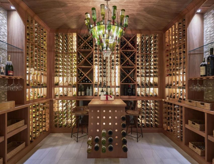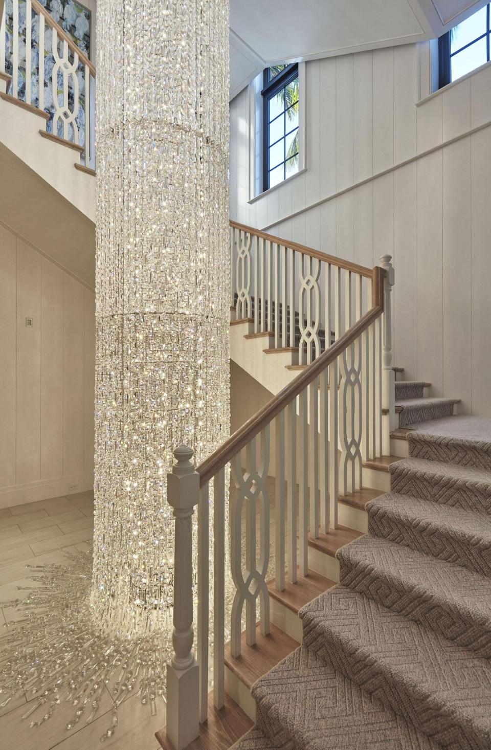 Outra característica impressionante da propriedade é um candelabro de cristal Swarovski a iluminar o meio das escadas que ligam os três andares.