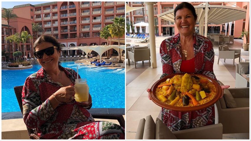 Dolores Aveiro está em Marraquexe, Marrocos, só com mulheres, entre elas a filha Elma e a designer de interiores Paula Brito, não se poupando nos luxos, principalmente à mesa onde tem provado o melhor.