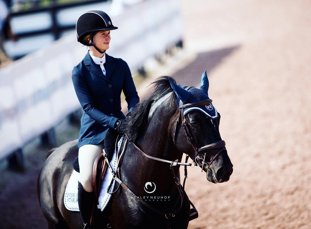 Vestida com um uniforme de equitação azul e branco com botas pretas altas, a universitária terminou em 46.º numa das fases da competição, quatro pontos atrás da sua rival Jessica Springsteen, de 26 anos.