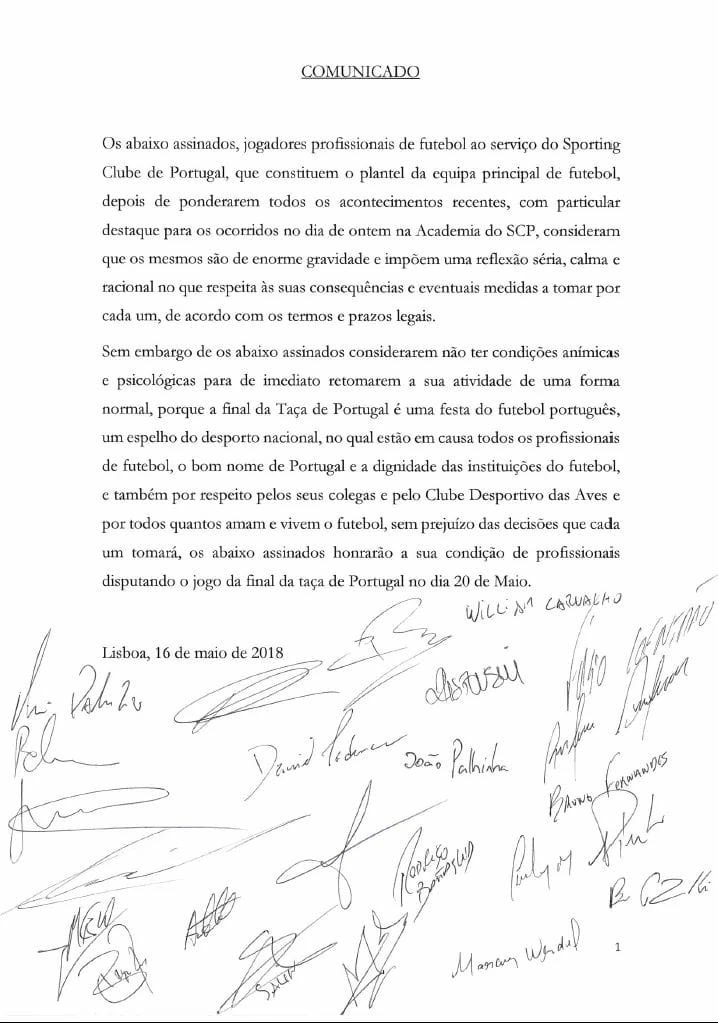 “Sem prejuízo das decisões que cada um tomará, os abaixo assinados honrarão a sua condição de profissionais, disputando o jogo da final da Taça de Portugal no dia 20 de maio”, lê-se na missiva subscrito pela maioria do plantel do Sporting, após uma reunião com o Sindicato dos Jogadores.