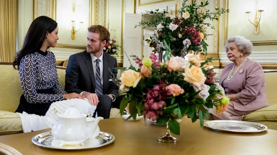 A atriz Parisa Fitz-Henley, que interpretou Meghan Markle, usou o vestido na cena em que a duquesa conheceu a Rainha Isabel II, num encontro para um chá. Uma internauta atenta deu conta de que duas convidadas usavam o mesmo modelo e uma terceira também, mas na versão branca.