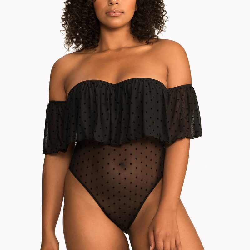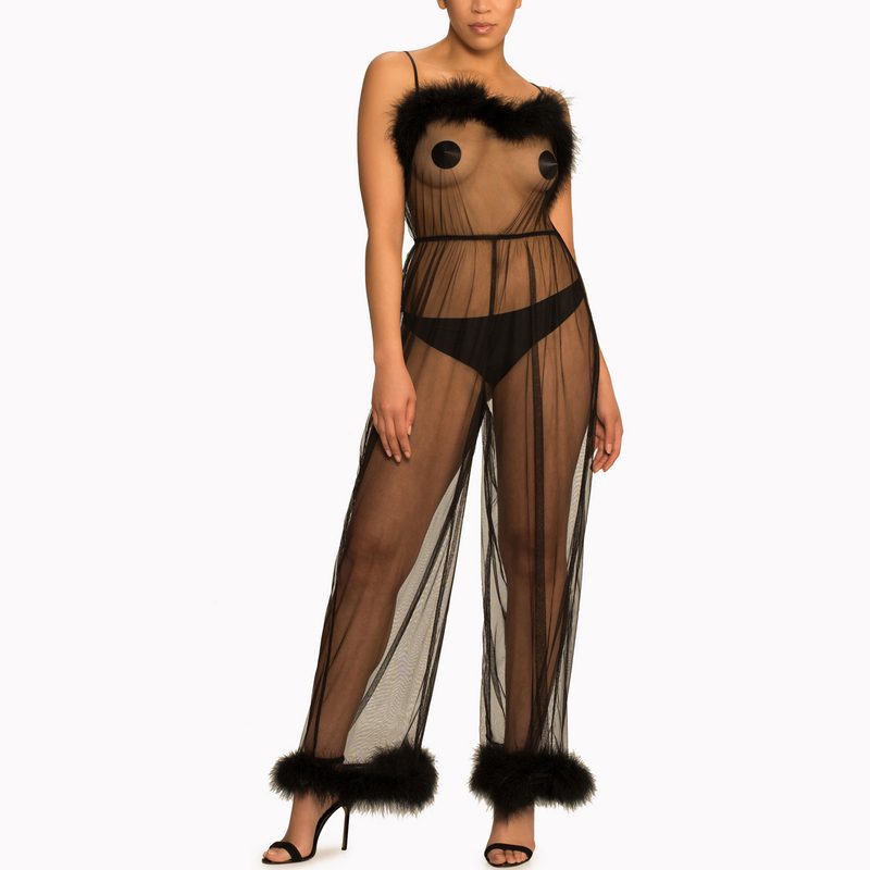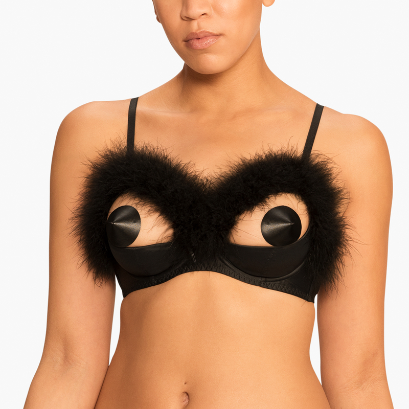 A linha inclui bodies cavados, macacões transparentes, soutien com aberturas e plumas. Ora veja: