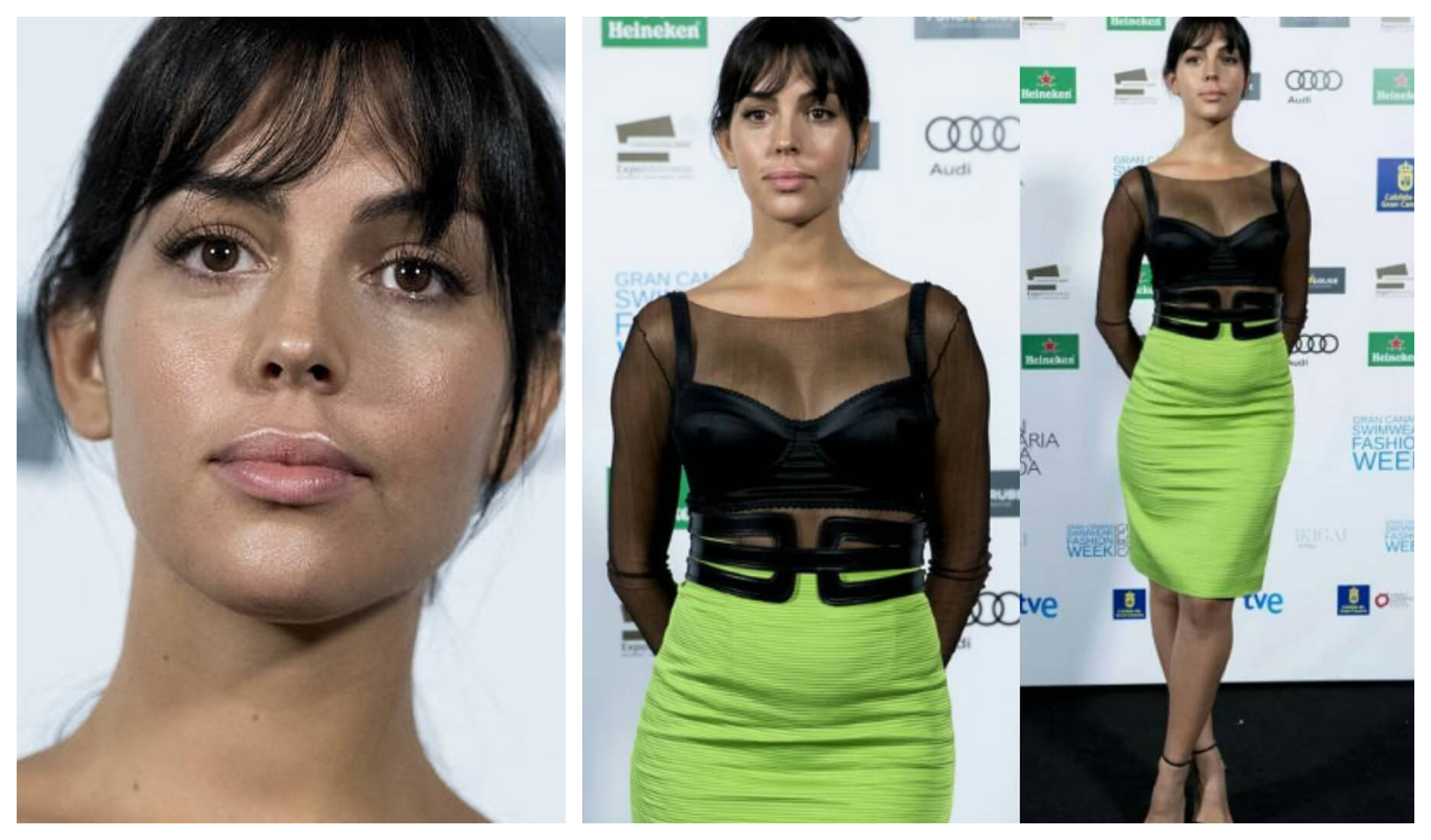 Na passerelle, a espanhola posou com uma saia verde florescente subida, com um cinto preto, um top e um bustiê transparente com mangas compridas, também em preto. Georgina levou o cabelo apanhado para trás, num rabo de cavalo e usou uma maquilhagem muito discreta e natural.