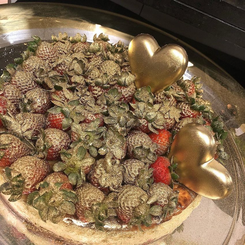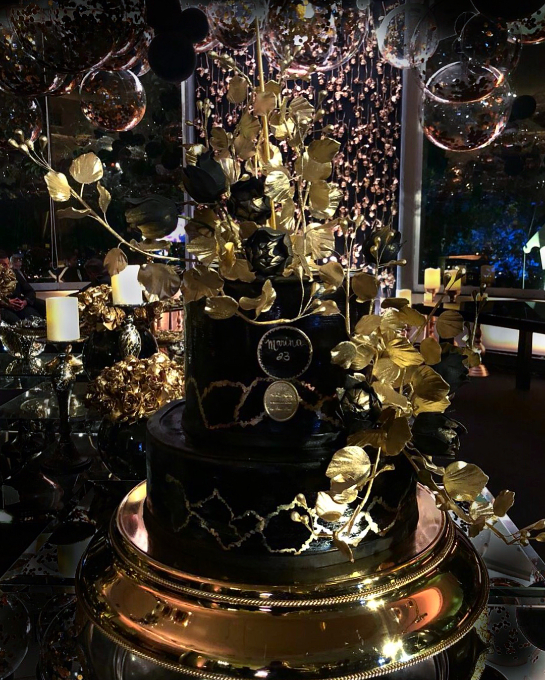 A festa foi toda em volta de tons dourados e pretos. Marina exibiu o seu bolo de aniversário, todo ele preto com dois andares e folhas à sua volta em tons dourados. Desvendou ainda alguns detalhes da decoração do espaço onde realizou o convívio.