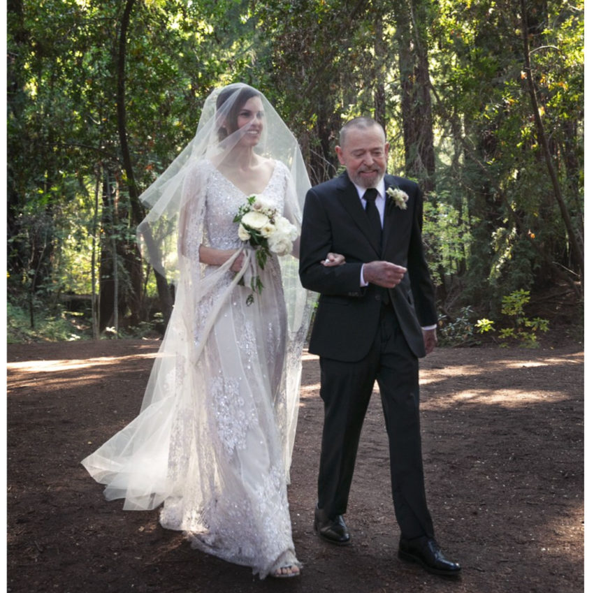Hilary elegeu dois looks para a ocasião. O primeiro assinado pelo estilista libanês Elie Saab, usado durante a cerimónia na floresta.