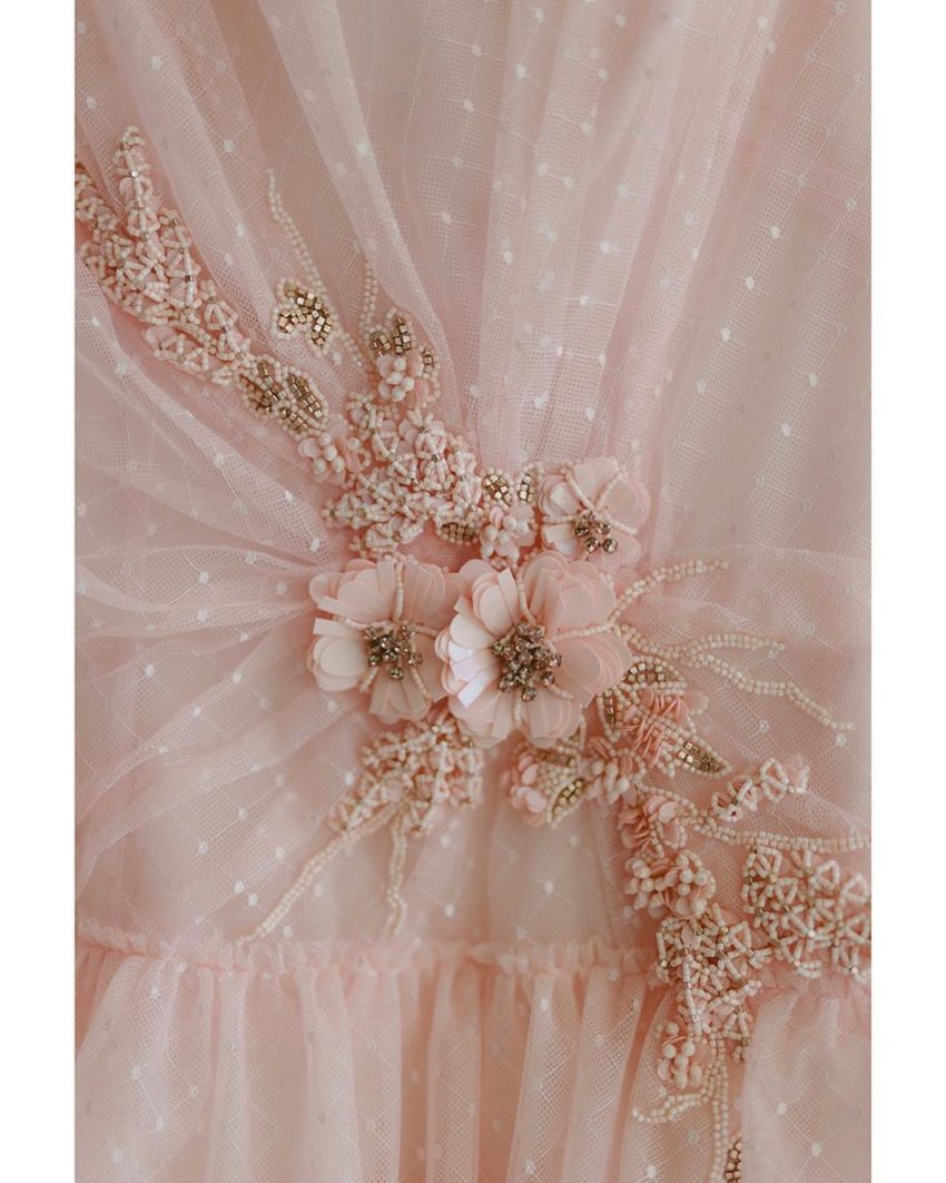Mandy escolheu um vestido romântico cor-de-rosa da Rodarte, de gola subida, muito tule, folhos e pequenos detalhes com flores em alto relevo. O véu e os sapatos, também em rosa, assim como o buquê da noiva e a decoração do espaço, emprestaram um ar fantasioso e emotivo à cerimónia.