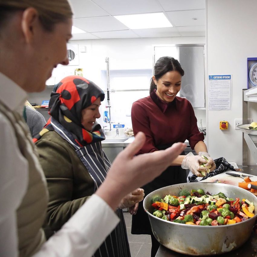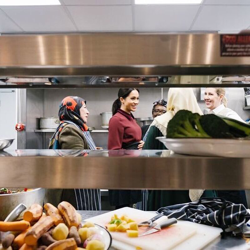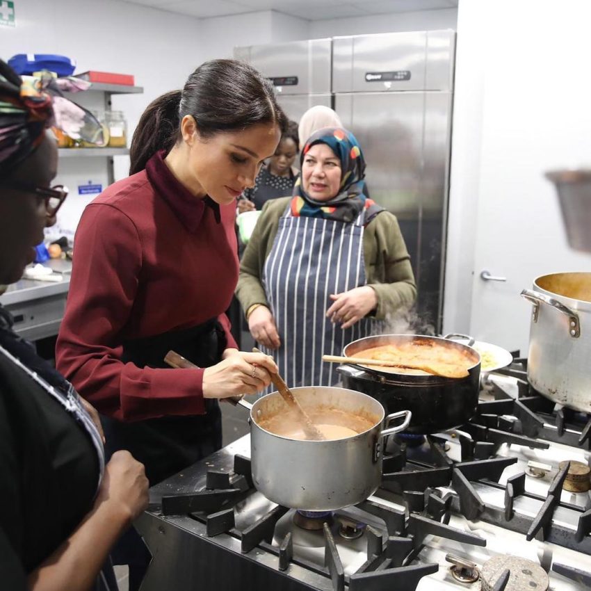 Depois de uma calorosa receção, Meghan Markle colocou o avental e participou nos preparativos de 300 refeições para a comunidade local, enquanto ouviu novidades sobre a extensão na cozinha iniciados pelas mulheres.