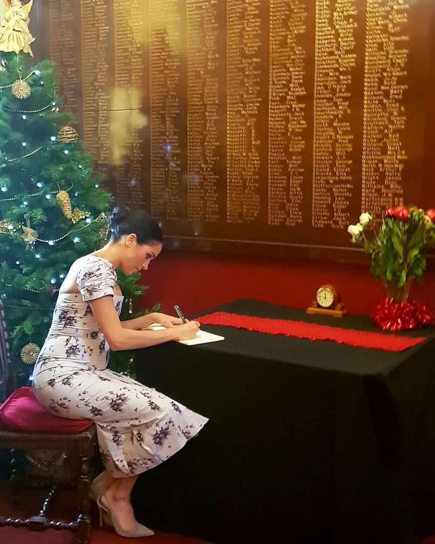 Para a ocasião a mulher do príncipe Harry usou um vestido floral, muito justo, da Brock Collection. Uma peça da coleção do Resort 2019 que tem o preço de 925 euros.