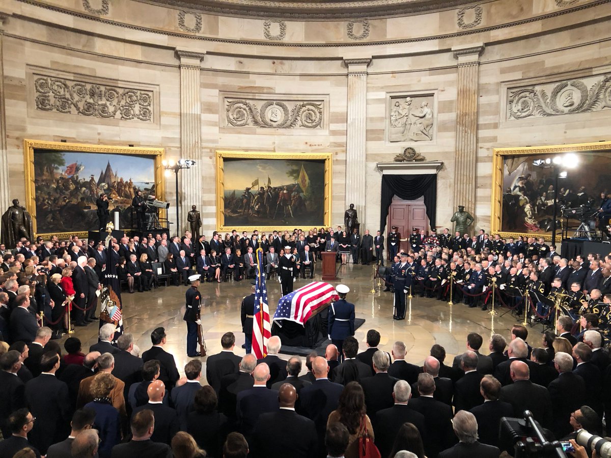 Donald Trump e a primeira-dama Melania, o vice-presidente Mike Pence e grande parte dos representantes do Partido Republicano ao qual Bush dedicou a sua vida, uniram-se no tributo ao ex-presidente e acompanharam os cinco filhos e netos no velório.