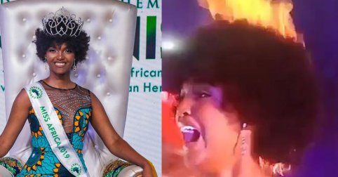 Na altura em que foi nomeada Miss África 2018, a jovem chorou de alegria, mas, assim que percebeu que tinha o cabelo em chamas, devido aos comemorativos fogos de artifício lançados no palco, começou a gritar aterrorizada.